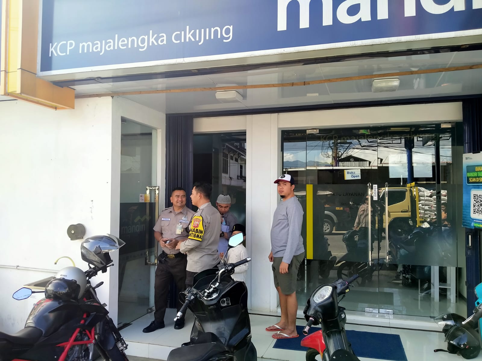 Majalengka – Untuk memberikan pengamanan pada Obyek Vital yang ada di wilayah hukum Polsek Cikijing, Personil Polsek Cikijing Polres Majalengka Polda Jabar, Bhabinkamtibmas Aiptu Usin dan Brigadir Riki Gemi melaksanakan Patroli Mobiling ke Bank BRI Unit Cikijing, Bank BJB KCP Cikijing dan Bank Mandiri KCP Cikijing, Selasa (11/07/2023).