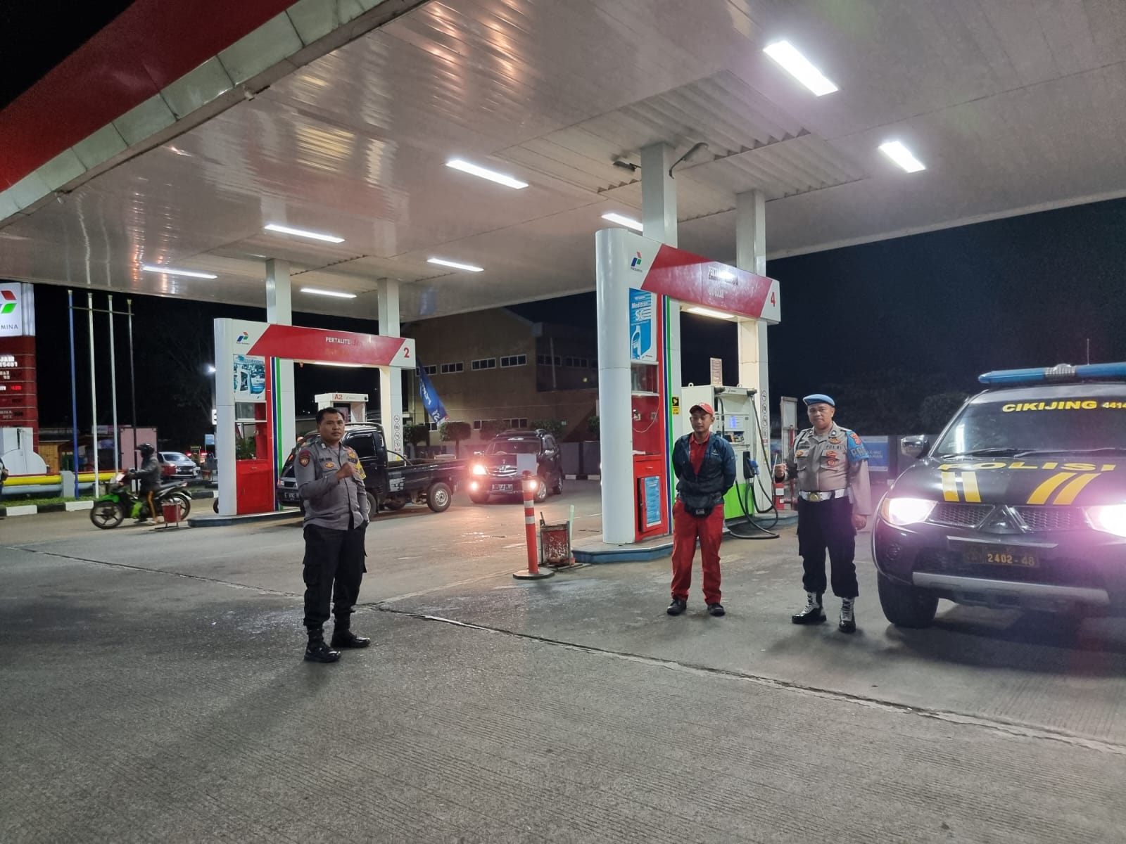 Majalengka – Personil Polsek Cikijing Polres Majalengka Polda Jabar, Ps. Panit Provos Aiptu Memen Suparman, S.H dan Bhabinkamtibmas Bripka Dede Arif melakukan Pengamanan dan monitoring di SPBU Cikijing Kabupaten Majalengka pada malam hari, Senin (10/07/2023) malam.