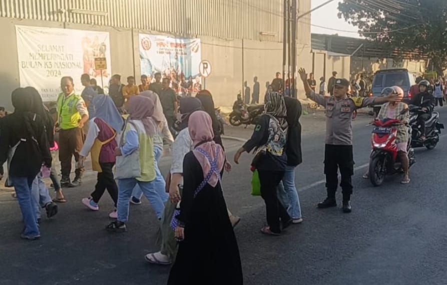 Majalengka, – Personil Polsek Dawuan, Polres Majalengka, Polda Jabar, AIPDA Devi Andriyana bersama BRIPKA Dadan Sungkawa, melaksanakan pengaturan lalu lintas pagi di depan PT. Leetex Garment Indonesia, Jalan Raya Cirebon – Bandung, Desa Sinarjati, Kecamatan Dawuan, Kabupaten Majalengka. Kamis (11/07/2024).