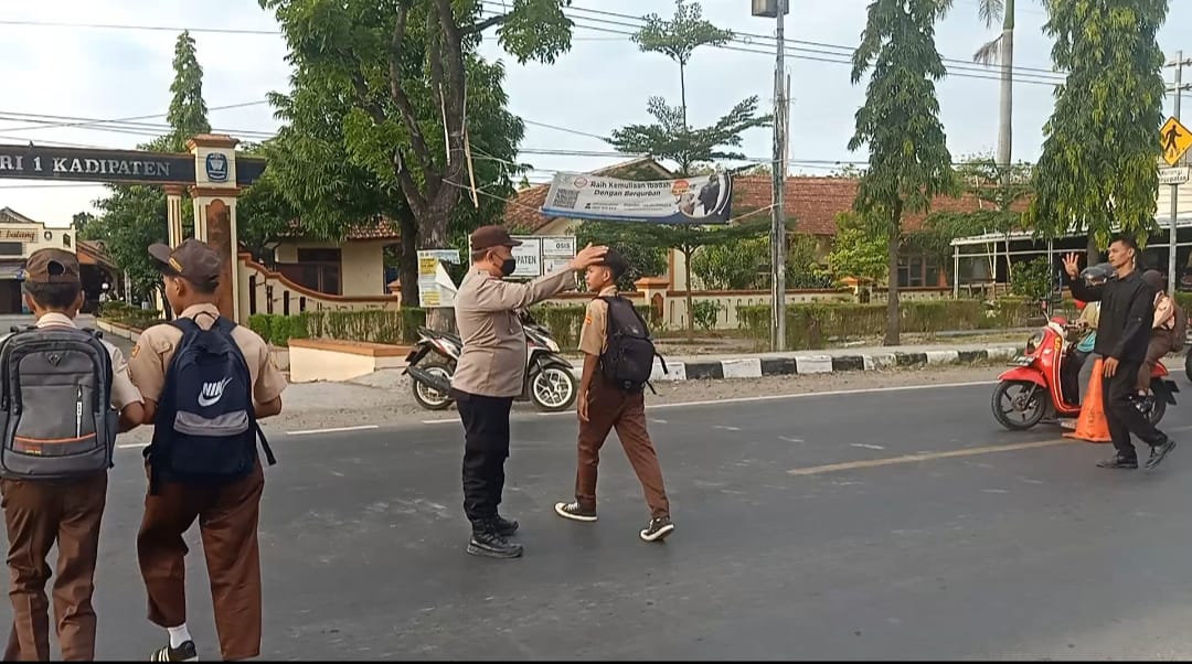 Kegiatan membantu anak sekolah menyeberangkan jalan dilaksanakan personil Polsek Kdp sewaktu melaksanakan gatur pagi di Jalan yaitu depan Sekolah SMP Negeri 1 Kdp Kecamatan Kabupaten Majalengka.