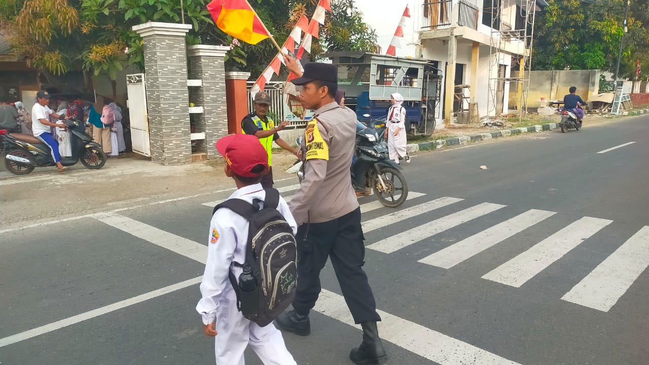 Di tengah ramainya arus lalu lintas, dua personel Polsek Krangkeng, Aipda Demi Sentosa dan Aipda Suparjo, sigap mengatur kendaraan sambil membantu para pelajar menyeberang jalan dengan aman.