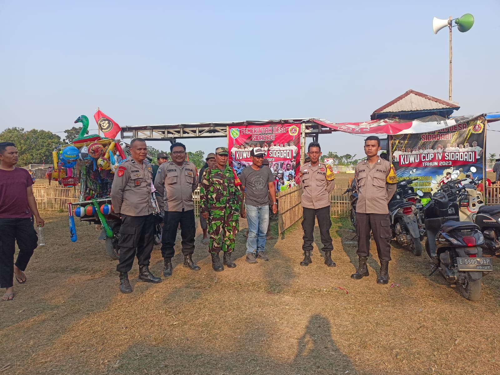 Polisi di Kecamatan Haurgeulis Bersama TNI Gelar Pengamanan Open Turnamen Sepak Bola Kuwu Cup IV Desa Sidadadi