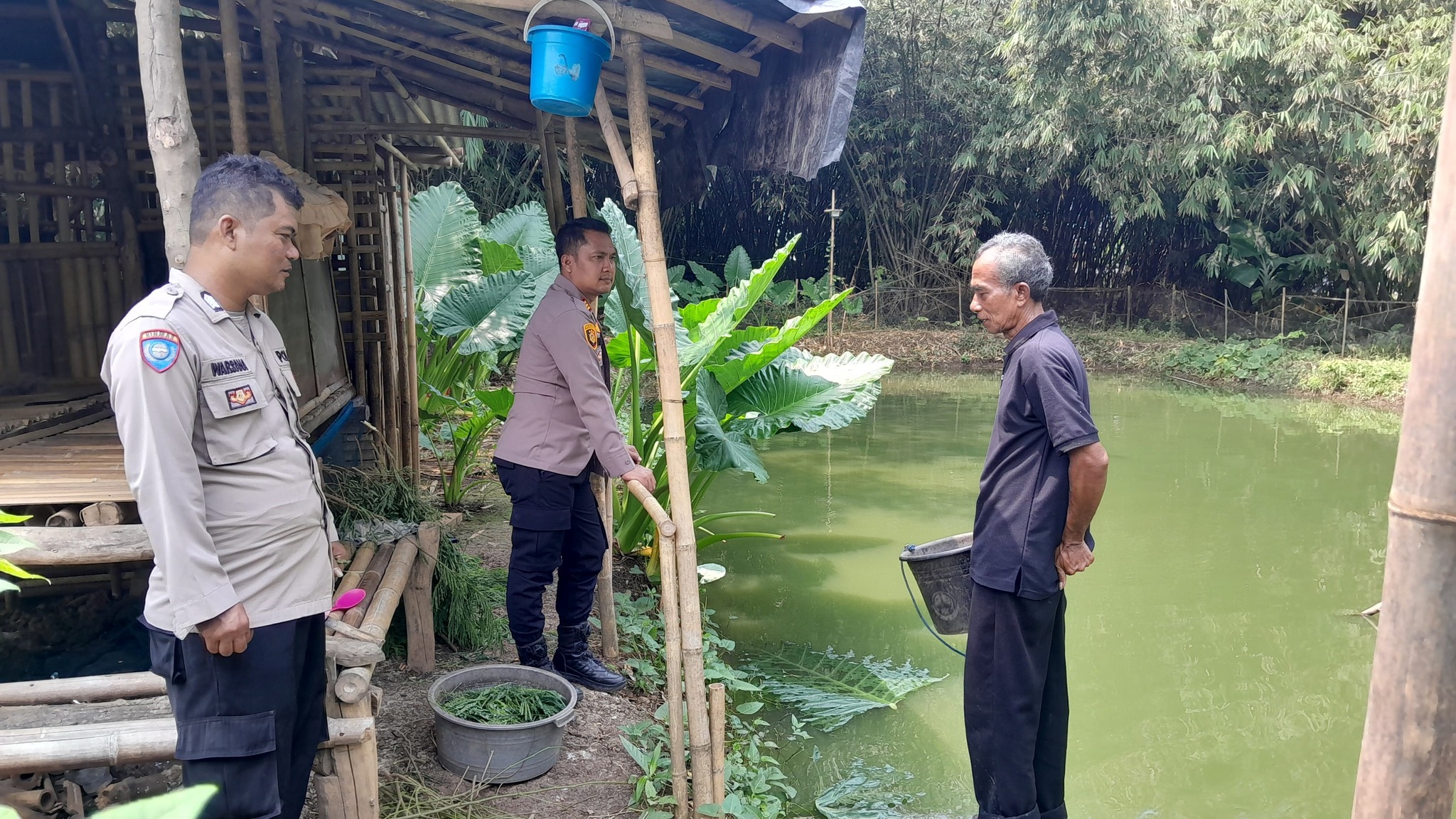 Dalam kunjungan tersebut, Kapolsek menyambangi Wangoto, salah satu warga yang aktif memanfaatkan lahan tidur dengan membuat kolam ikan berisi Mujair dan Nila.