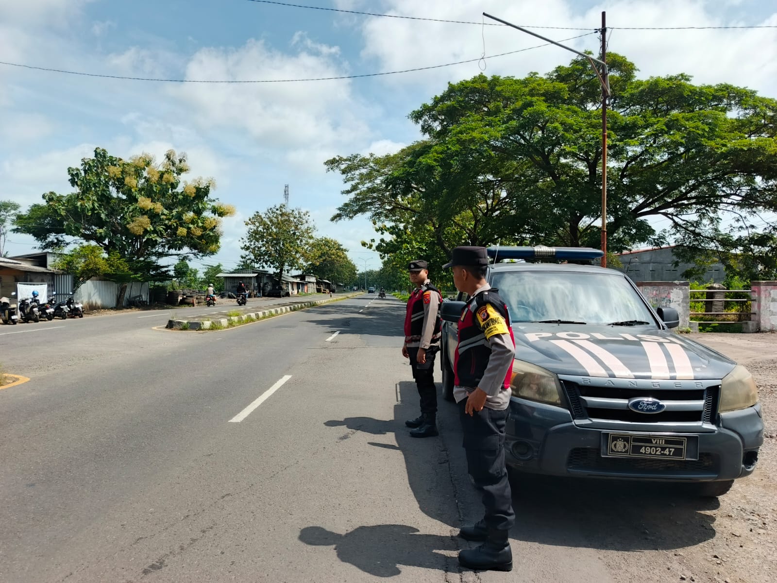 Tiga anggota berseragam lengkap terlihat bersiaga di salah satu ruas jalan utama wilayah Kecamatan Krangkeng. Menggunakan kendaraan dinas patroli, mereka berjaga sambil memantau arus lalu lintas serta aktivitas masyarakat di sekitar wilayah tersebut.