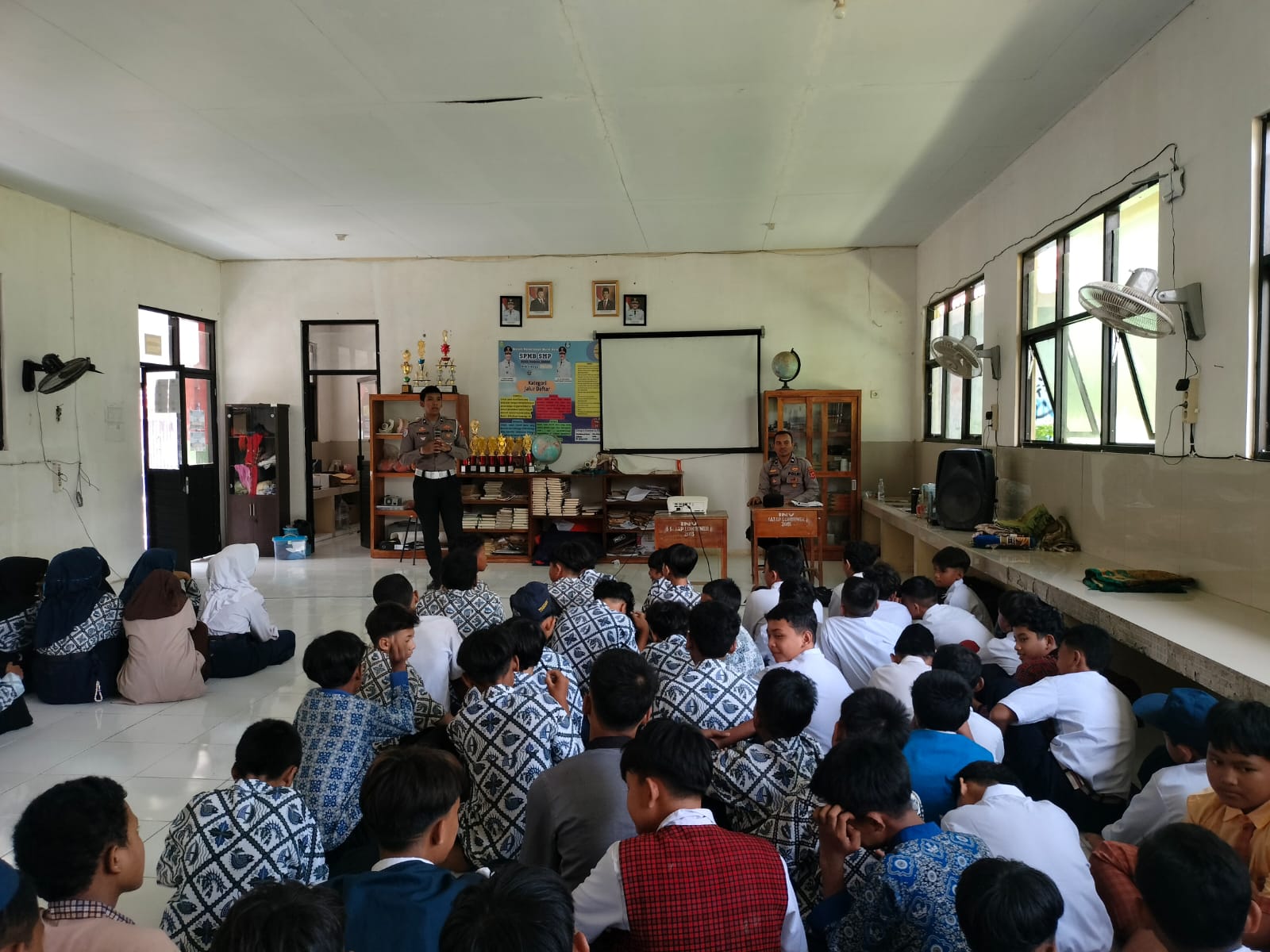 Para siswa baru duduk tertib, menyimak dengan penuh perhatian dua anggota kepolisian yang hadir memberikan materi penting dalam rangka Masa Pengenalan Lingkungan Sekolah (MPLS) Tahun Ajaran 2025/2026.