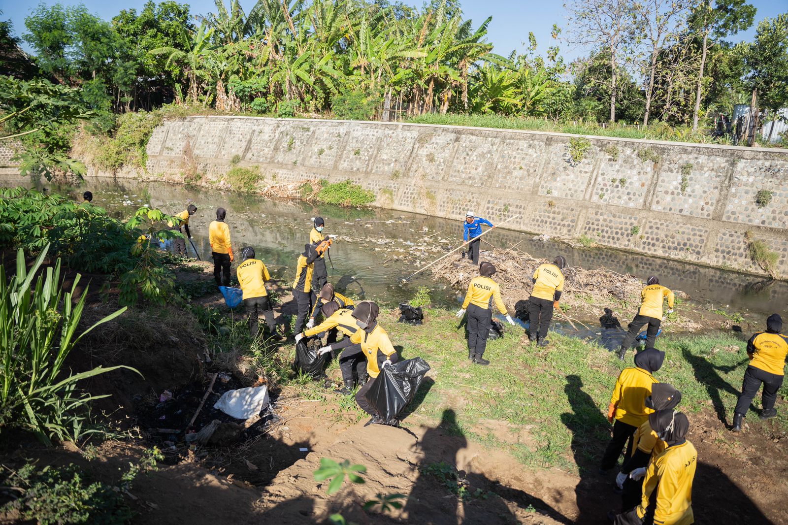 Dipimpin langsung Waka Polres Ponorogo, Kompol Verawati Thaib, S.I.K, para Polwan bergotong-royong bersama petugas Dinas Lingkungan Hidup serta masyarakat sekitar membersihkan sampah dan tanaman liar disepanjang aliran Sungai.