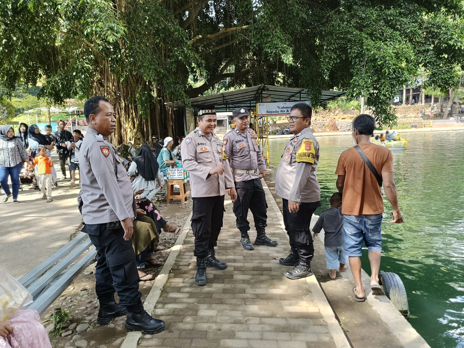 Sejumlah personil polri diterjunkan untuk memberikan keamanan dan kenyamanan para pengunjung pada masa libur panjang Idul Adha 1444 tahun 2023 di lokasi Obyek wisata Situ Cipanten. Sabtu (1/7/2023).
