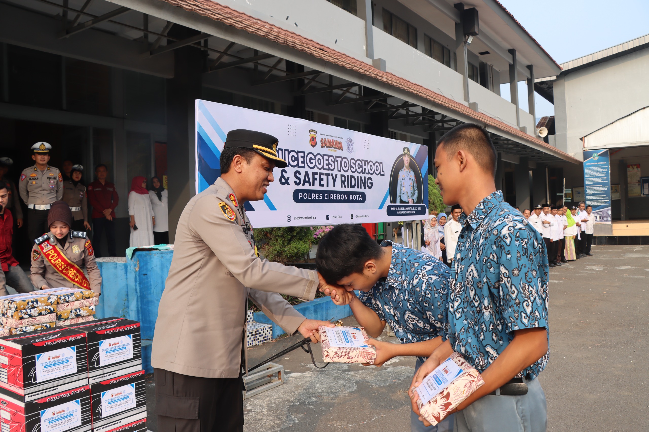 POLRES CIREBON KOTA,-Dalam rangka meningkatkan hubungan antara kepolisian dan masyarakat serta memberikan edukasi tentang keselamatan berkendara, Polres Cirebon Kota menggelar acara Police Goes to School & Safety Riding di SMKN 1 Cirebon.
