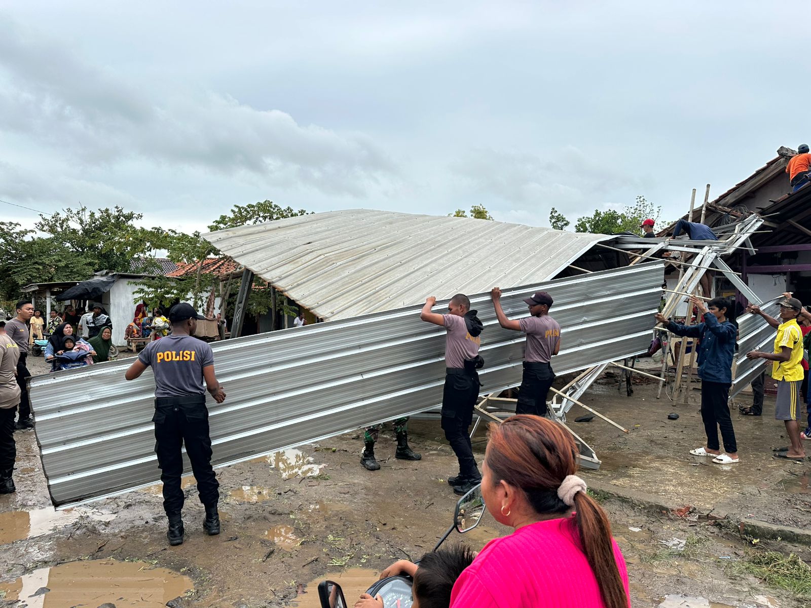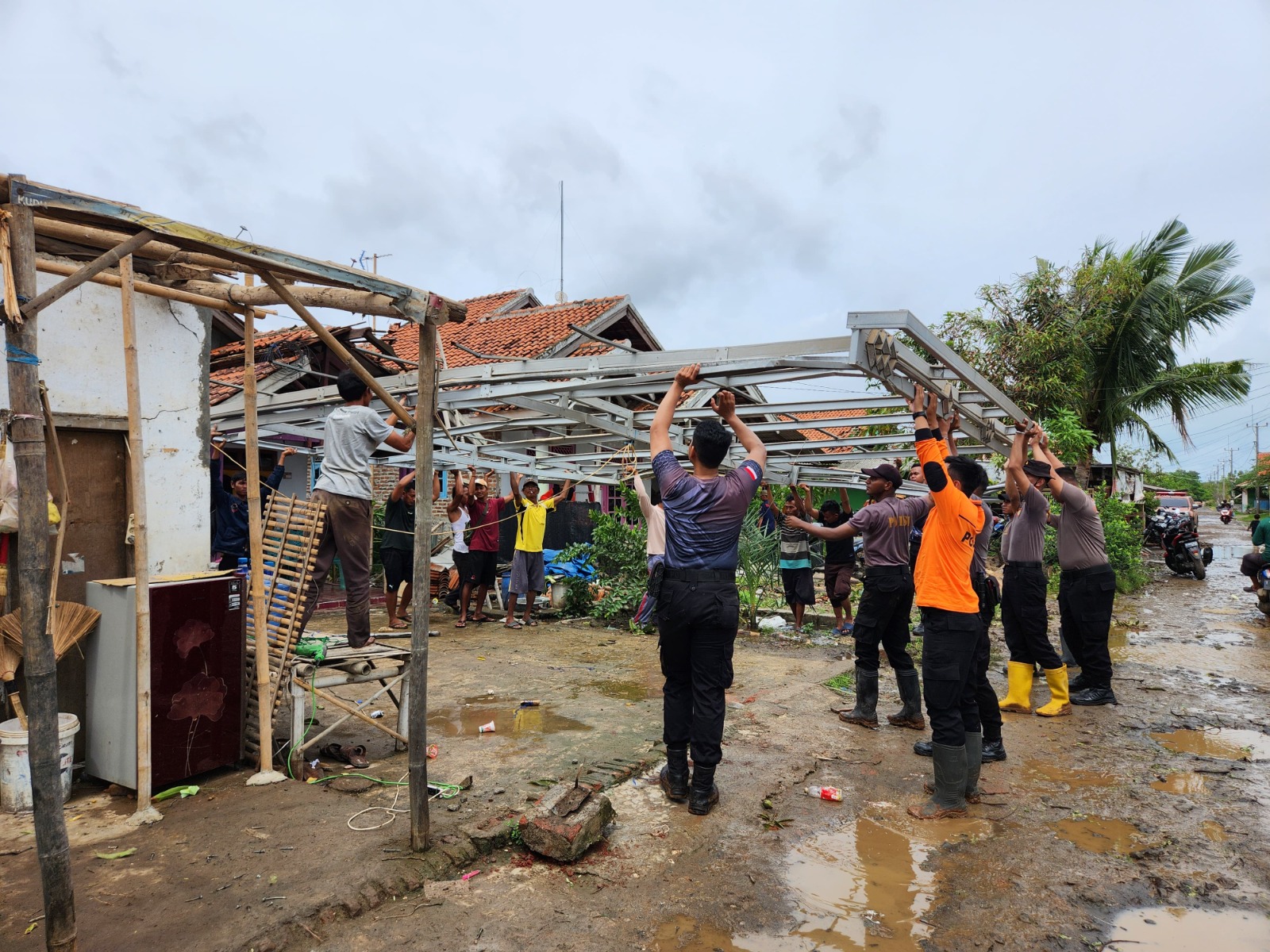 Indramayu – Anggota Polres Indramayu Polda Jabar bersama TNI dan Badan Penanggulangan Bencana Daerah (BPBD) Kabupaten Indramayu melakukan evakuasi pohon tumbang serta membantu merapikan puing-puing rumah yang roboh akibat angin puting beliung di Desa Pabean Ilir, Kecamatan Pasekan, Kabupaten Indramayu, Rabu (8/1/2025).