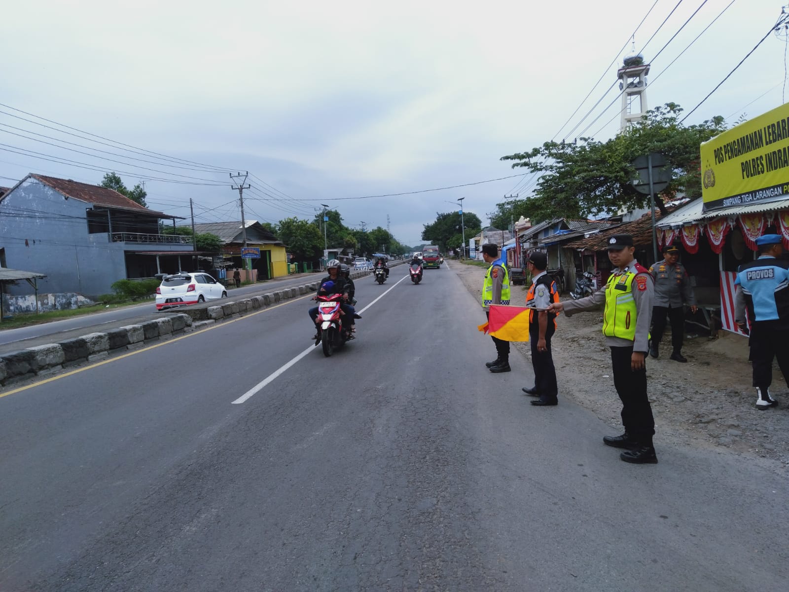 Kegiatan pengaturan arus lalu lintas dilakukan secara intensif di jalan raya Pos Pam Simpang Tiga Larangan, Kecamatan Lohbener, Kabupaten Indramayu. Jumat pagi (12/4/2024)