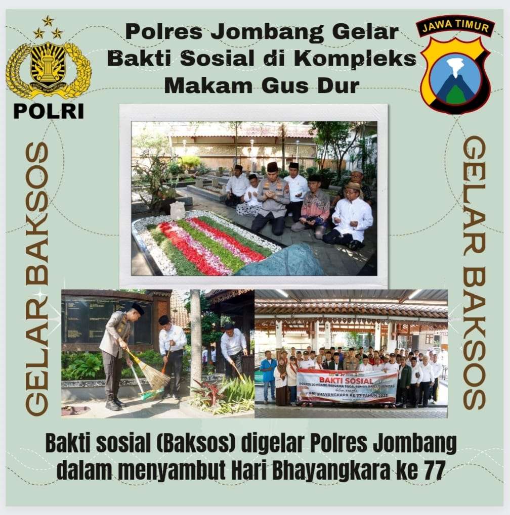 “Makam mantan Presiden Abddurrahman Wahid atau Gus Dur yang sekaligus sebagai tempat wisata religi, karena kawasan tersebut dikunjungi ribuan orang setiap harinya sehingga dengan kepedulian tersebut sebagai wujud nyata polri untuk menciptakan kenyamanan dan keamanan di masyarakat,” ujarnya.