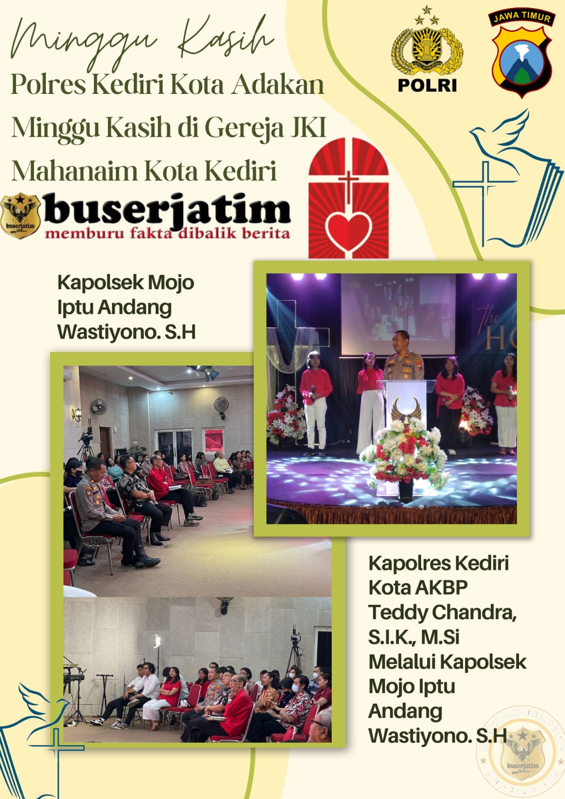 BUSERJATIM.COM || KEDIRI KOTA – Dalam rangka mendekatkan diri dan menyerap aspirasi masyarakat, Polres Kediri Kota menggelar kegiatan Minggu Kasih yang digelar di Gereja JKI Mahanaim Kota Kediri, Minggu (20/8/2023).