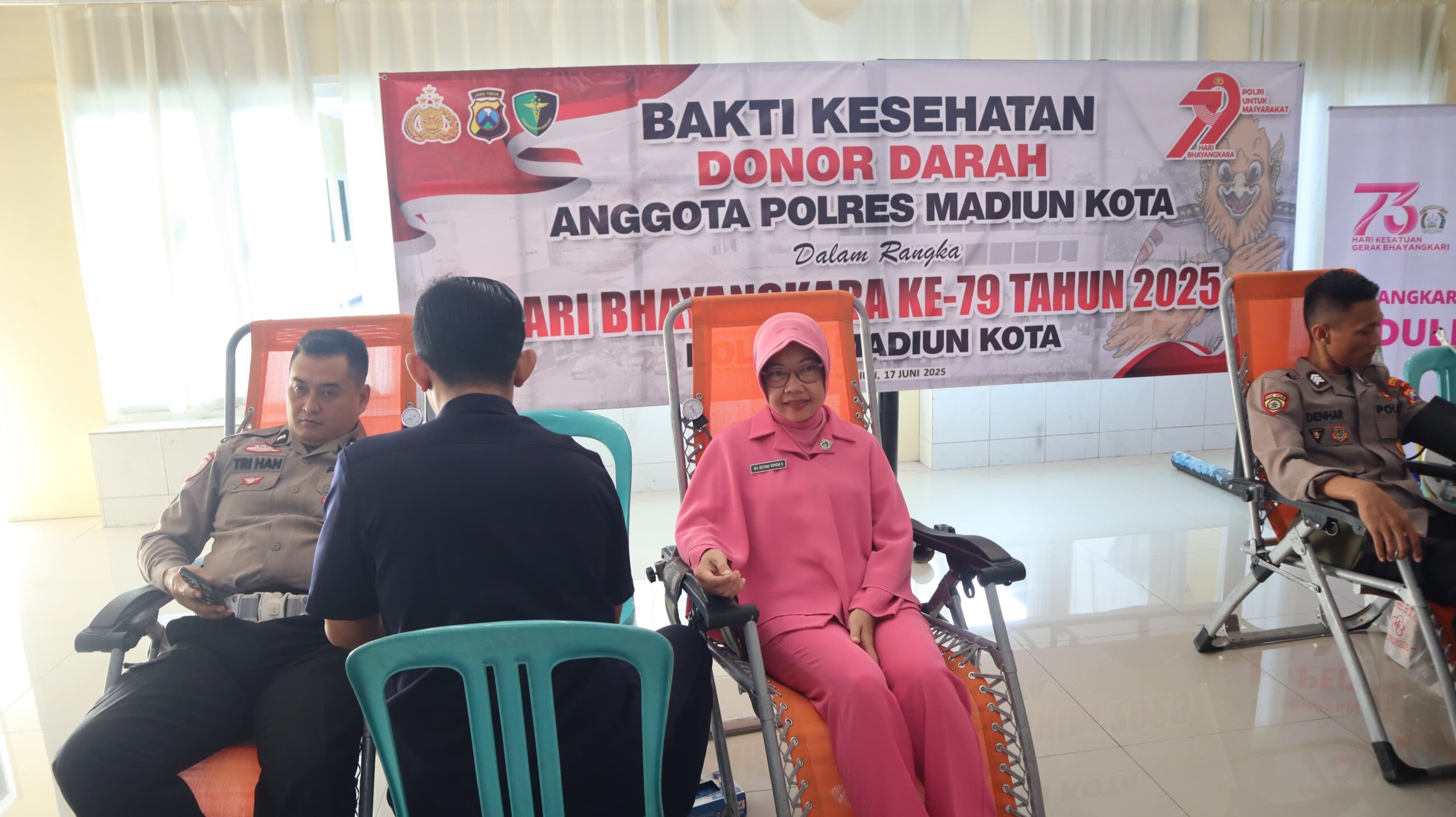 MADIUN,BUSERJATIM.COM-, 17 Juni 2025 – Dalam rangka memperingati Hari Bhayangkara ke-79 Tahun 2025, Polres Madiun Kota melaksanakan kegiatan bakti kesehatan dengan mengadakan donor darah di Gedung Siedokkes Polres Madiun Kota. Kegiatan ini diikuti oleh 97 orang dari berbagai latar belakang, termasuk personel Polres Madiun Kota, anggota TNI, Brimob, Bhayangkari, ASN, PHL, dan masyarakat umum.