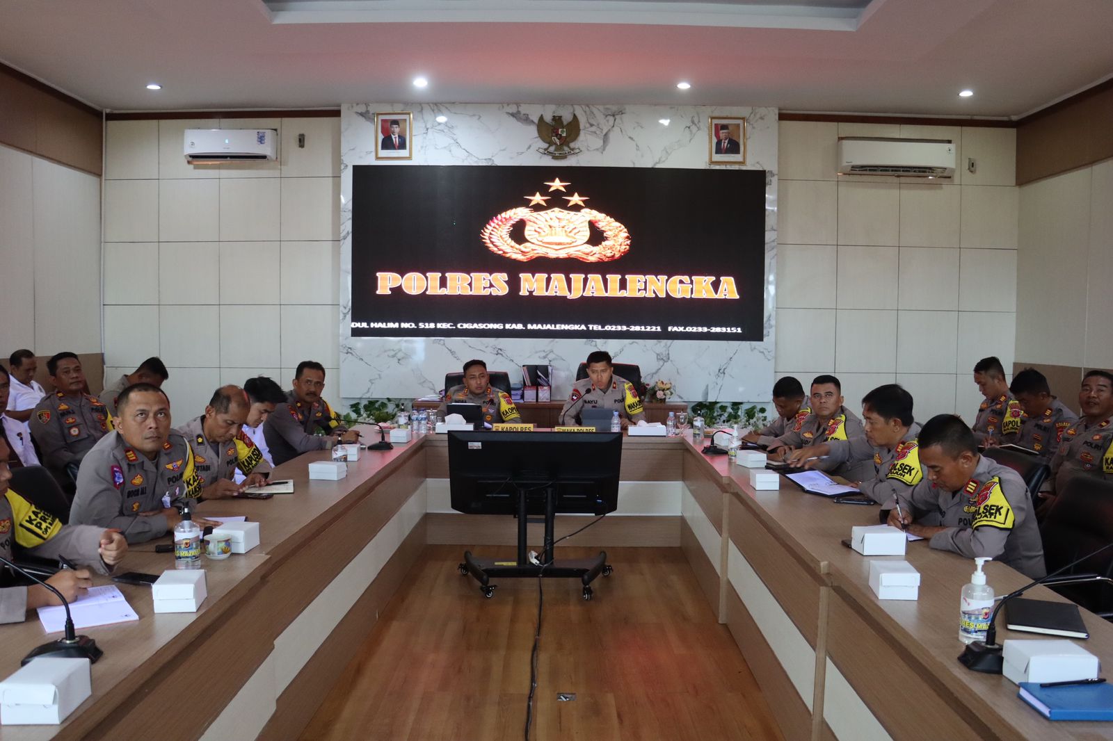 Majalengka, Kapolres Majalengka Polda Jabar AKBP Indra Novianto, S.I.K., M.Si., CPHR., didampingi oleh Wakapolres Majalengka, Kompol Bayu Purdantono, S.I.K. M.I.K., beserta Pejabat Utama (PJU) Polres Majalengka dan Kapolsek Jajaran, mengikuti Video Conference (Vicon) Anev Situasi Kamtibmas Polda Jabar yang dipimpin langsung oleh Kapolda Jabar, Irjen. Pol. Dr. Akhmad Wiyagus, S.IK., M.Si., MM., Senin (5/2/2024).