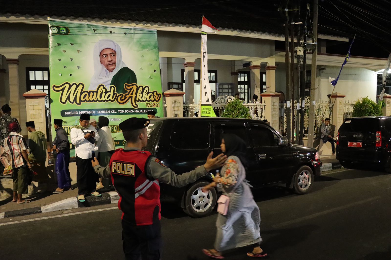 Majalengka, Polres Majalengka laksanakan pengamanan di acara Maulid Akbar 1445 H di Masjid Miftahul Jannah Kelurahan Tonjong Majalengka, Senin (25/9/2023).