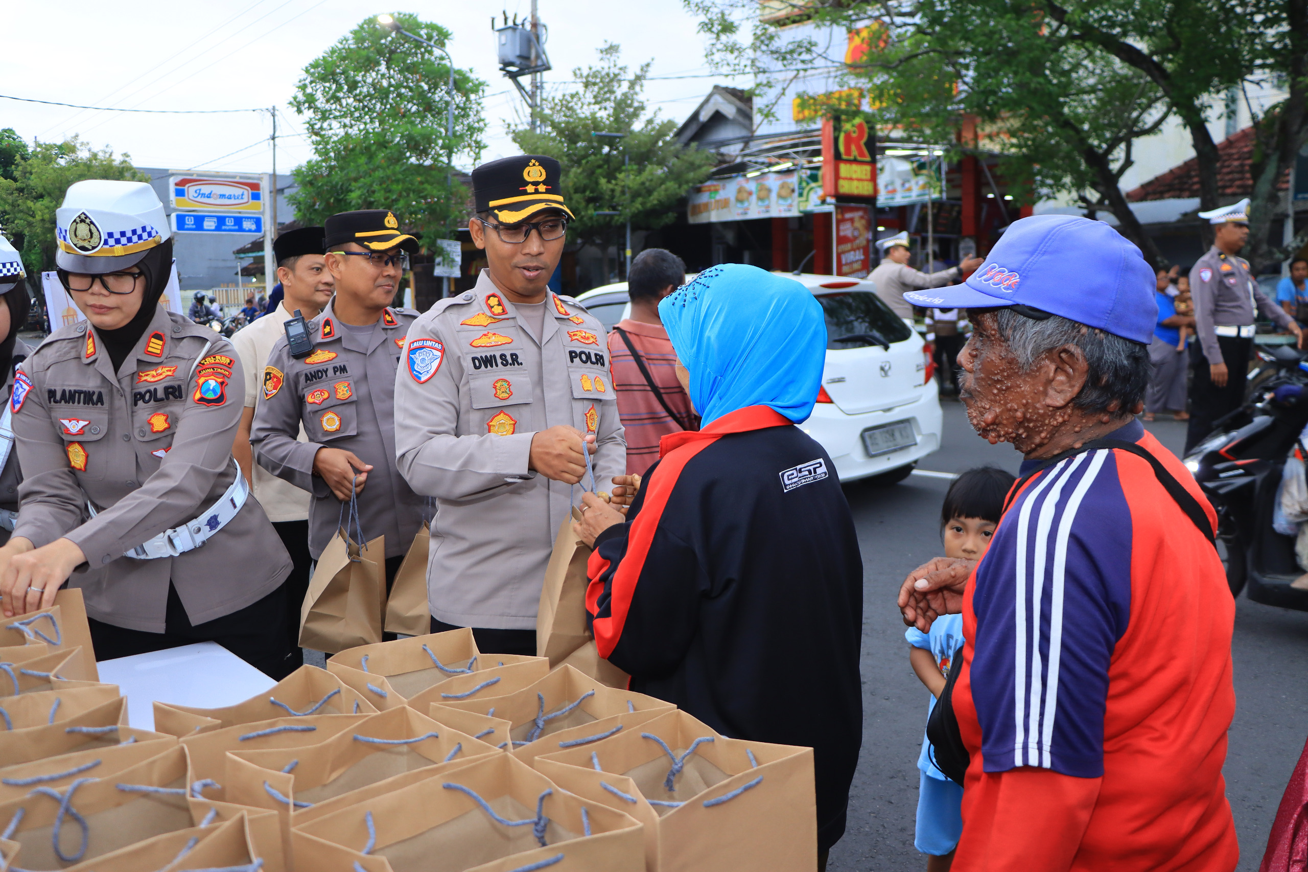 “Hati-hati di jalan raya, bila ada hal yang mencurigakan, segera lapor Polisi atau telepon 110. Jangan takut ya,” ucap Kapolres Ngawi sambil menyerahkan takjil kepada warga.
