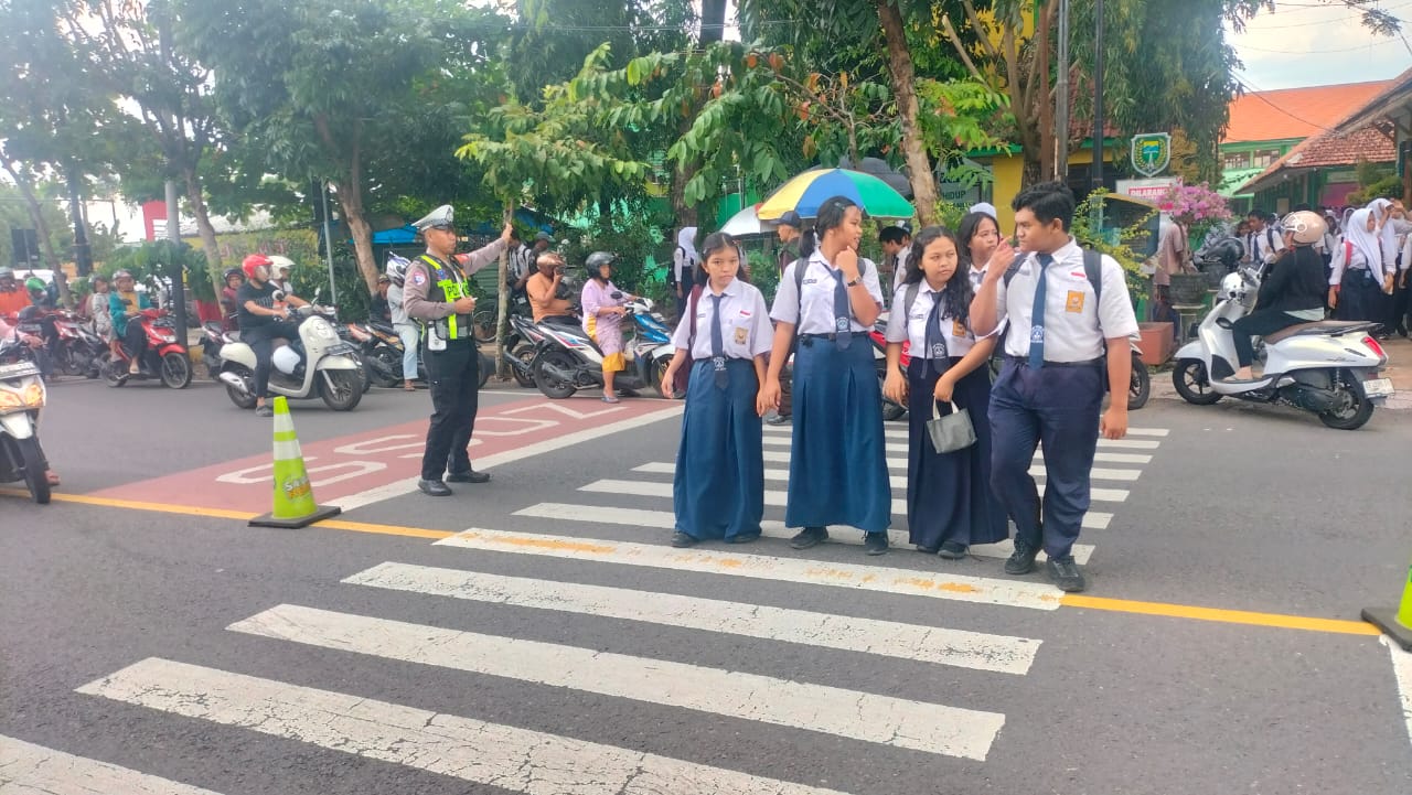 Setiap pagi dan siang hari, personel Satlantas rutin melakukan kegiatan pengaturan lalu lintas di sejumlah titik sekolah di Kota Madiun.