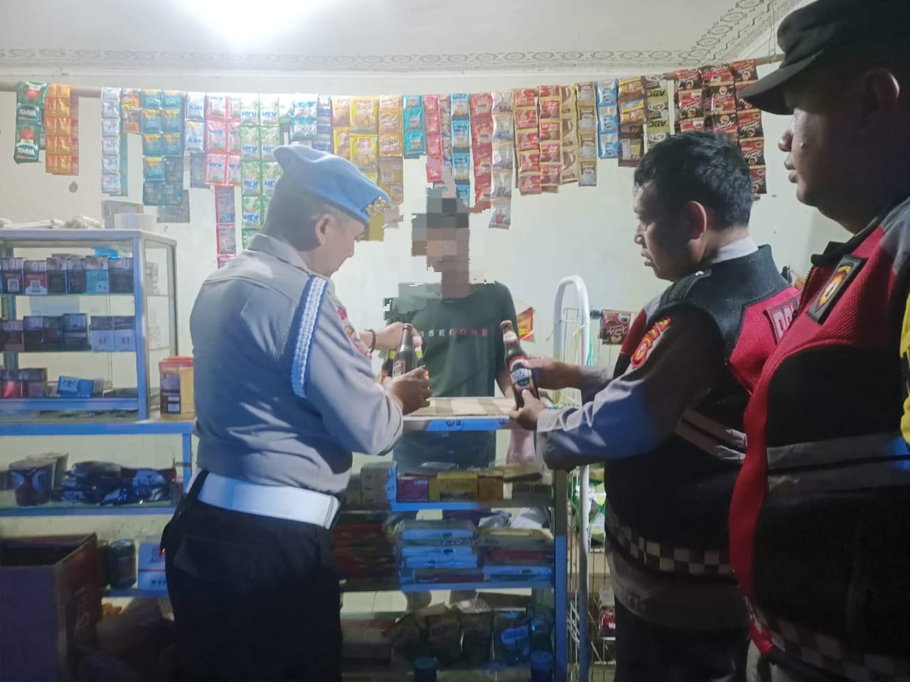 Dalam patroli malam tersebut petugas berhasil mengamankan barang bukti berupa satu unit knalpot brong dan empat botol minuman keras jenis anggur kolesom dan dua botol bir angker dari seorang warga berinisial T (25).