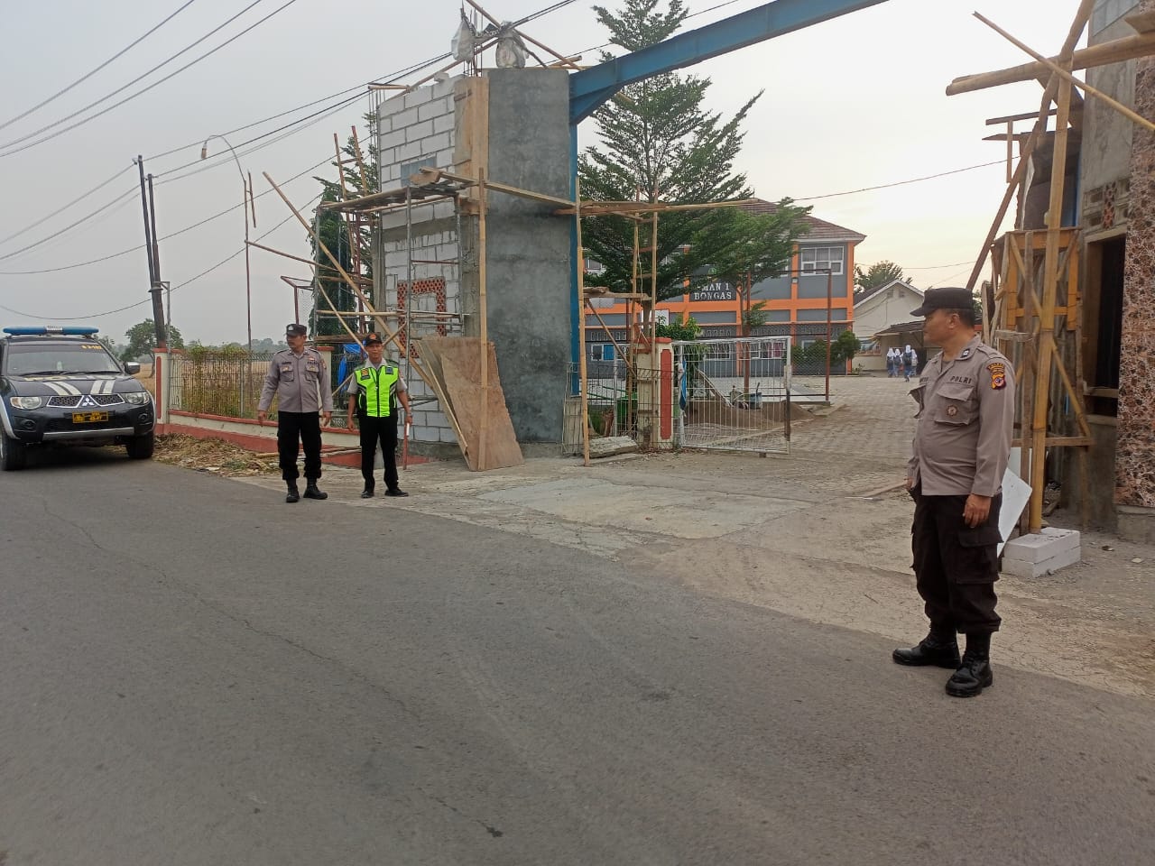 Indramayu,– Personil Polsek Bongas jajaran Polres Indramayu Polda Jabar melakukan pengaturan arus lalulintas di Jalan Raya Desa Margamulya SMUN 1 Bongas, Kecamatan Bongas, Kabupaten Indramayu, Senin (27/5/2024) pagi.