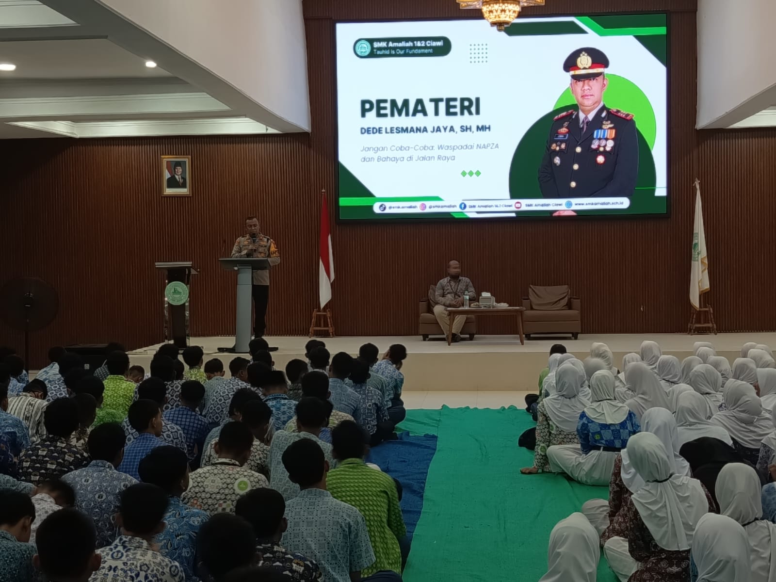 Turut hadir dalam kegiatan ini, Kepala SMK Amaliah 1, Tisna Sudrajat, S.I.Kom., GR., ACA, serta Kepala SMK Amaliah 2, Dr. Gugun Gunadi, S.Pd., M.Pd., beserta jajaran guru dan staf sekolah. Materi yang disampaikan oleh Kapolsek Ciawi mencakup pencegahan narkoba, tertib berlalu lintas, upaya menghindari perundungan (bullying), serta bijak dalam menggunakan media sosial.