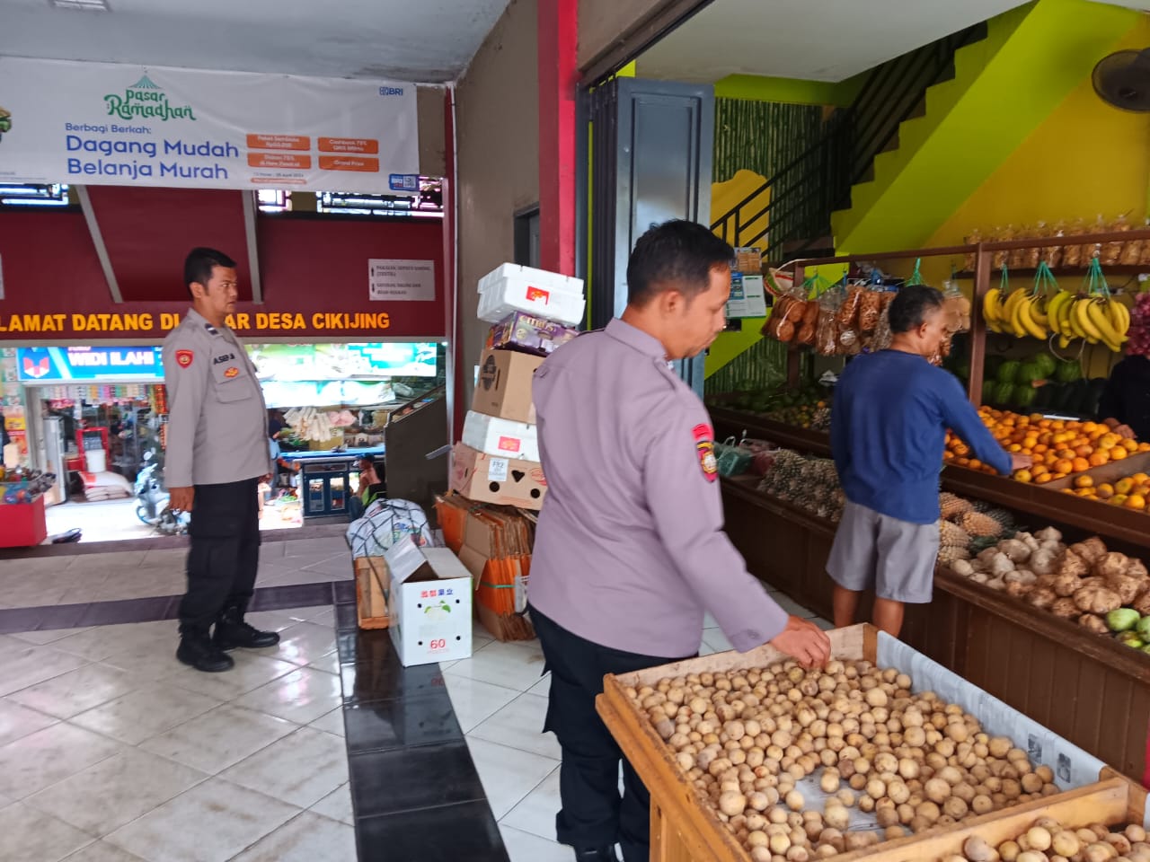 Majalengka,- Dalam upaya membangun kemitraan yang erat antara anggota Polri dan masyarakat demi terciptanya situasi kamtibmas yang aman dan kondusif, personil Polsek Cikijing Polres Majalengka Polda Jabar, Ps. Panit Samapta Aipda Eman Subagja dan Ka SPKT Aipda Asep Nugroho, menyambangi penjual buah di Pasar Cikijing, Kecamatan Cikijing, Kabupaten Majalengka, pada Selasa (23/04/2024).