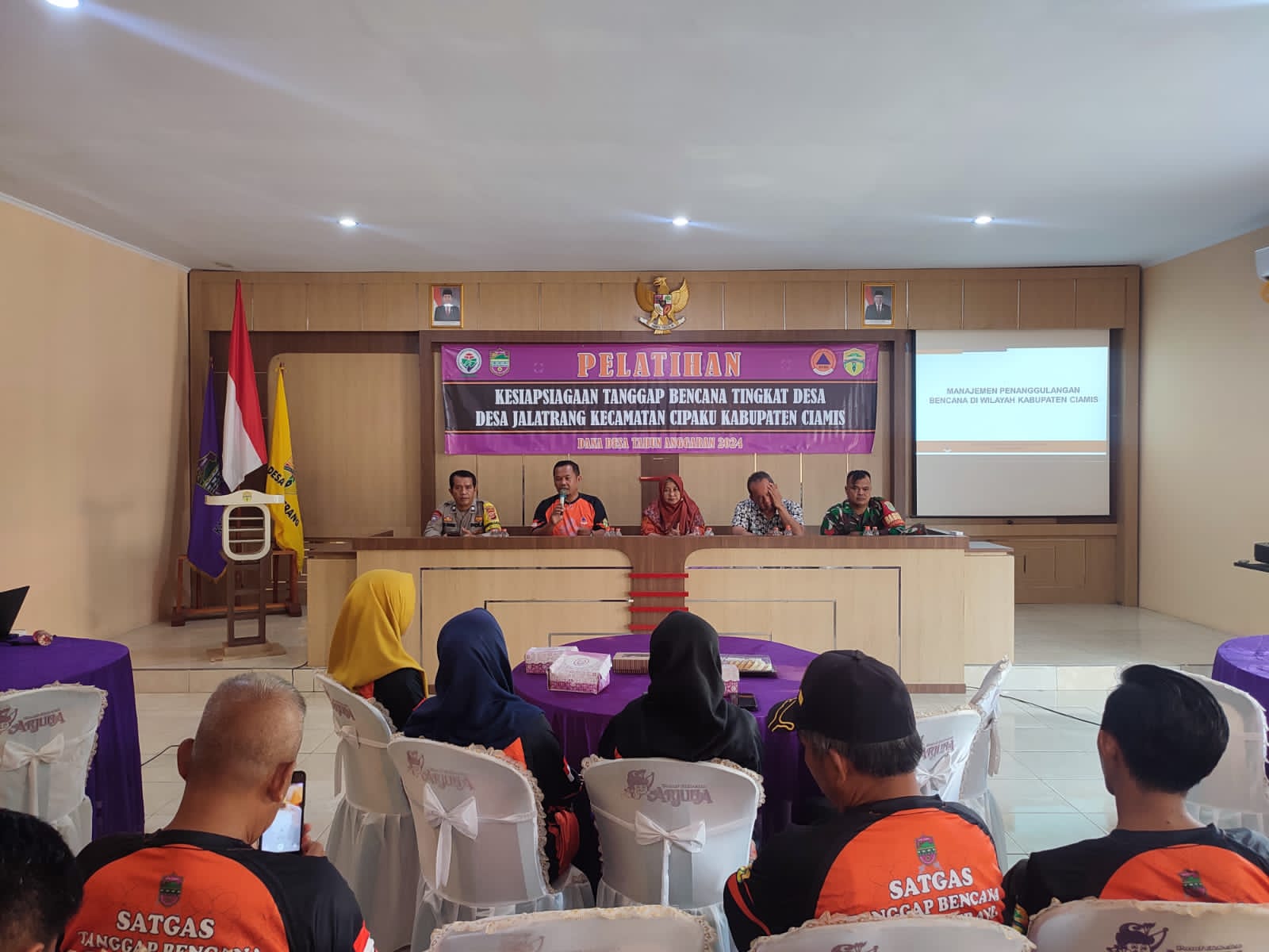 CIAMIS ~ Personel Polsek Cipaku Polres Ciamis Polda Jabar menghadiri acara pelatihan kesiapsiagaan tanggap bencana tingkat desa. Acara pembukaan tersebut digelar di aula Kantor Desa Jalatrang, Kecamatan Cipaku, Kabupaten Ciamis, Jawa Barat, Kamis (20/6/2024).