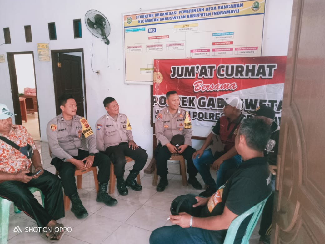 Kegiatan Jumat Curhat dilaksanakan di Desa Rancahan Kecamatan Gabuswetan Kabupaten Indramayu, dihadiri warga setempat yang dipimpin langsung Kapolsek Gabuswetan AKP Agus Kristiana, S.HI., didampingi Kanit Propam Polsek Gabuswetan Aiptu Rokhman dan Anggota Bhabinkamtibmas Polsek Gabuswetan Bripka Zaenal Abidin.