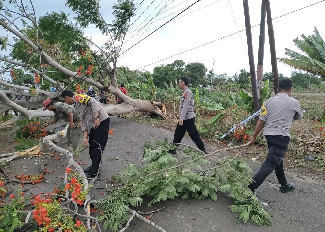 Indramayu, — Polsek Gabuswetan, jajaran Polres Indramayu Polda Jabar melakukan evakuasi pohon tumbang yang menghalangi Jalan PU Saradan – Wanguk di Desa Babakanjaya Blok Babakan Dampyang.