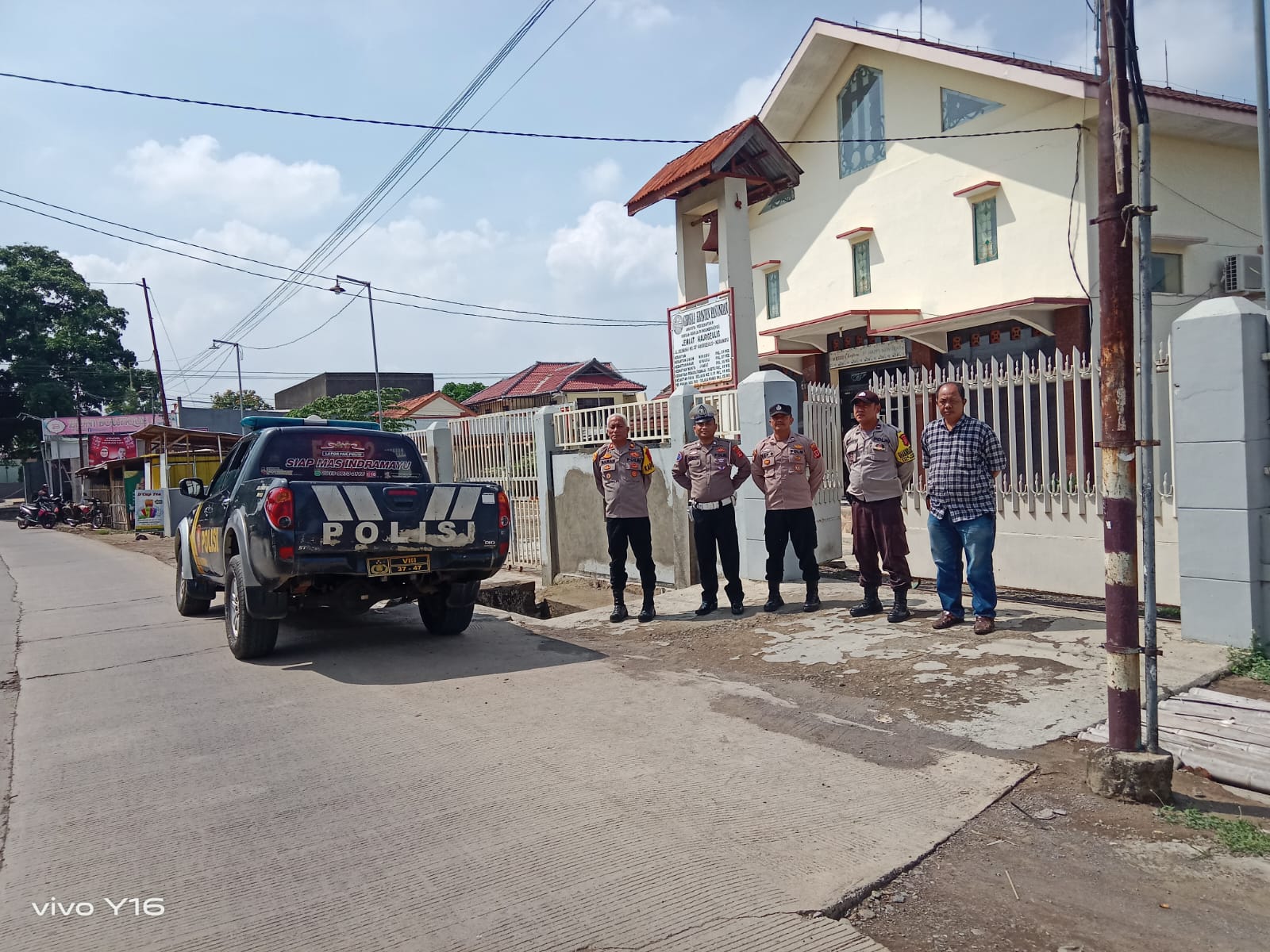 Dalam pengamanan tersebut, personel Polsek Haurgeulis berjaga di area sekitar gereja dan memantau situasi untuk mencegah potensi gangguan keamanan.