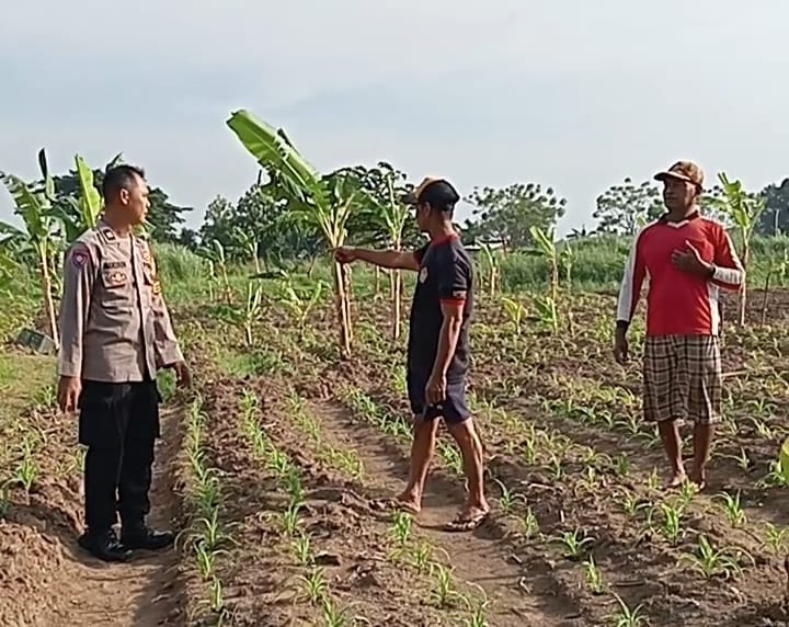 Aiptu Mulyadi selaku Bhabinkamtibmas Desa Pabean Udik meninjau langsung lahan seluas kurang lebih 4.000 meter persegi yang ditanami jagung pipil oleh kelompok tani setempat di bawah pengelolaan Akyadi.