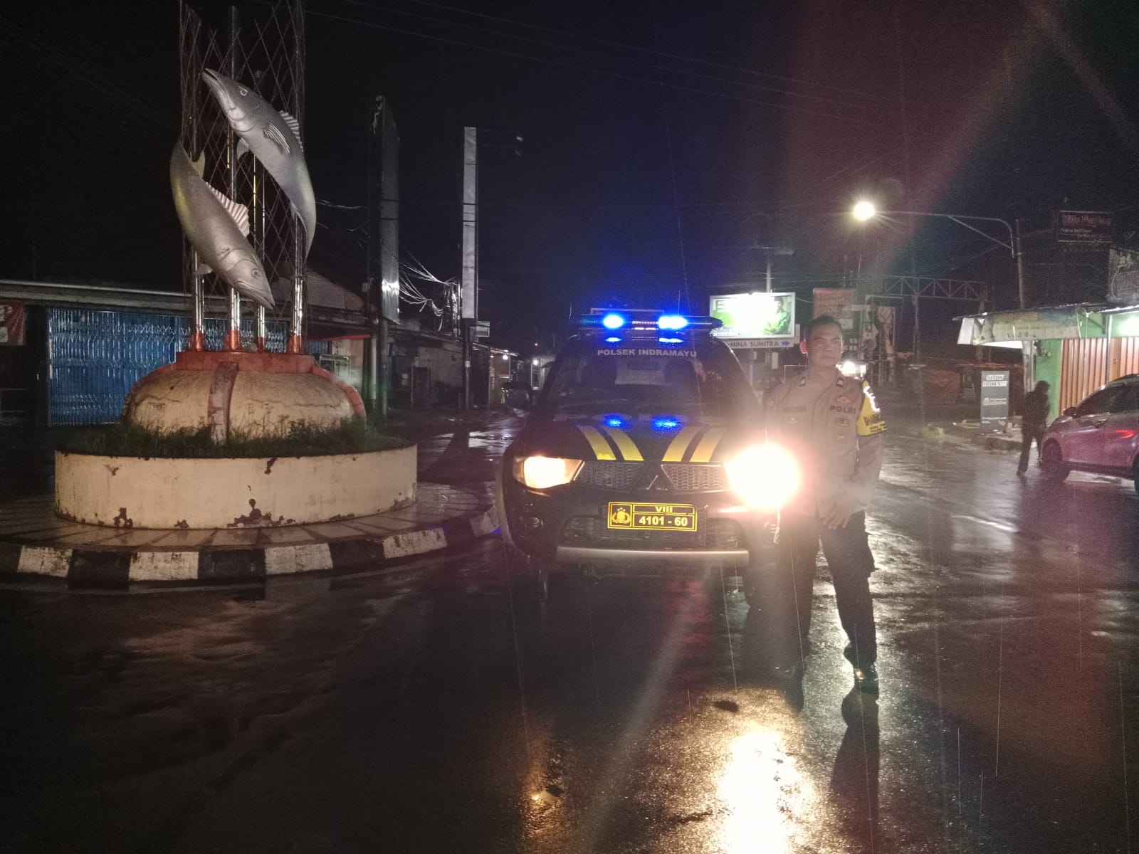 Personel Polsek Indramayu menggunakan kendaraan dinas yang dilengkapi lampu rotator untuk meningkatkan visibilitas dan mencegah potensi tindakan kriminal.