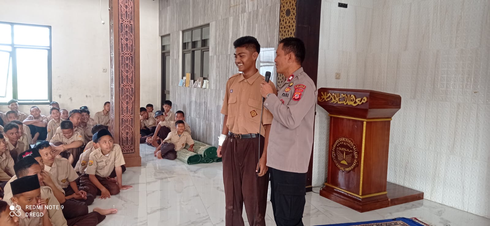 Kegiatan ini juga diisi dengan sesi interaktif, di mana beberapa siswa berani tampil ke depan untuk berdiskusi langsung dengan petugas. Suasana santai namun sarat makna terlihat dari tawa ringan yang mengiringi sesi tanya jawab, membuat pesan-pesan kamtibmas lebih mudah dicerna para remaja.