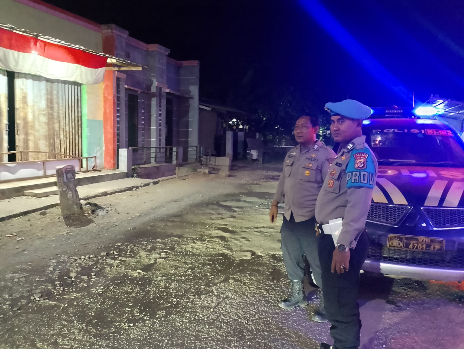 Patroli Mobile dengan menyalakan lampu rotator warna biru di sepanjang jalan baik pemukiman warga dan daerah rawan guna antisipasi cegah terjadinya C-3 dan gangguan kamtibmas.
