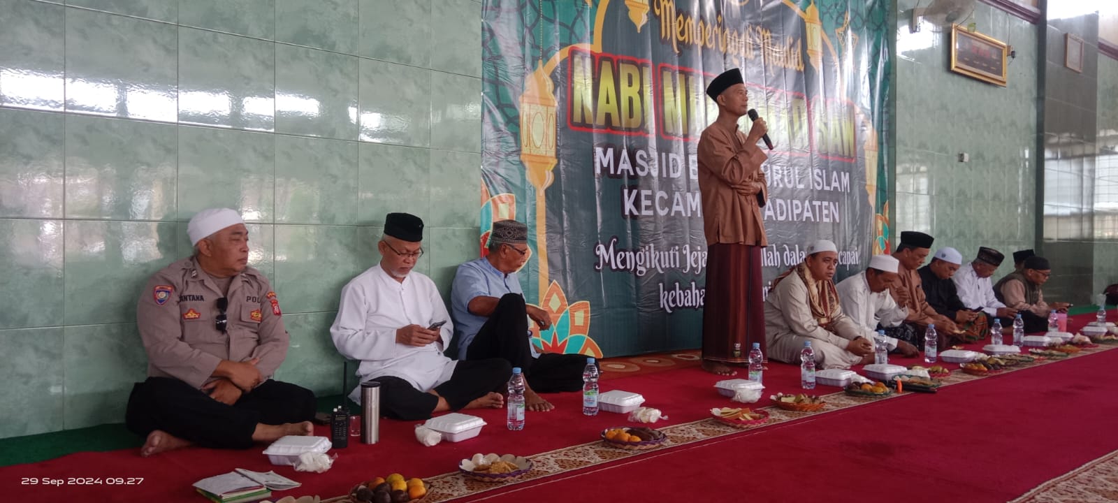 Majalengka – Dalam rangka memperingati Maulid Nabi Muhammad SAW 1446 H, Polsek Kadipaten Polres Majalengka Polda Jabar turut hadir dalam acara yang dilaksanakan di Mesjid Besar Nurul Islam, Desa Kadipaten, Kecamatan Kadipaten, Kabupaten Majalengka.Minggu (29/9/2024). Kapolsek Kadipaten AKP Asep Ashari, S.H., diwakili oleh PS. Panit Binmas Polsek Kadipaten Aiptu Aceng Santana, yang berbaur bersama masyarakat dalam memeriahkan kegiatan religius tersebut.