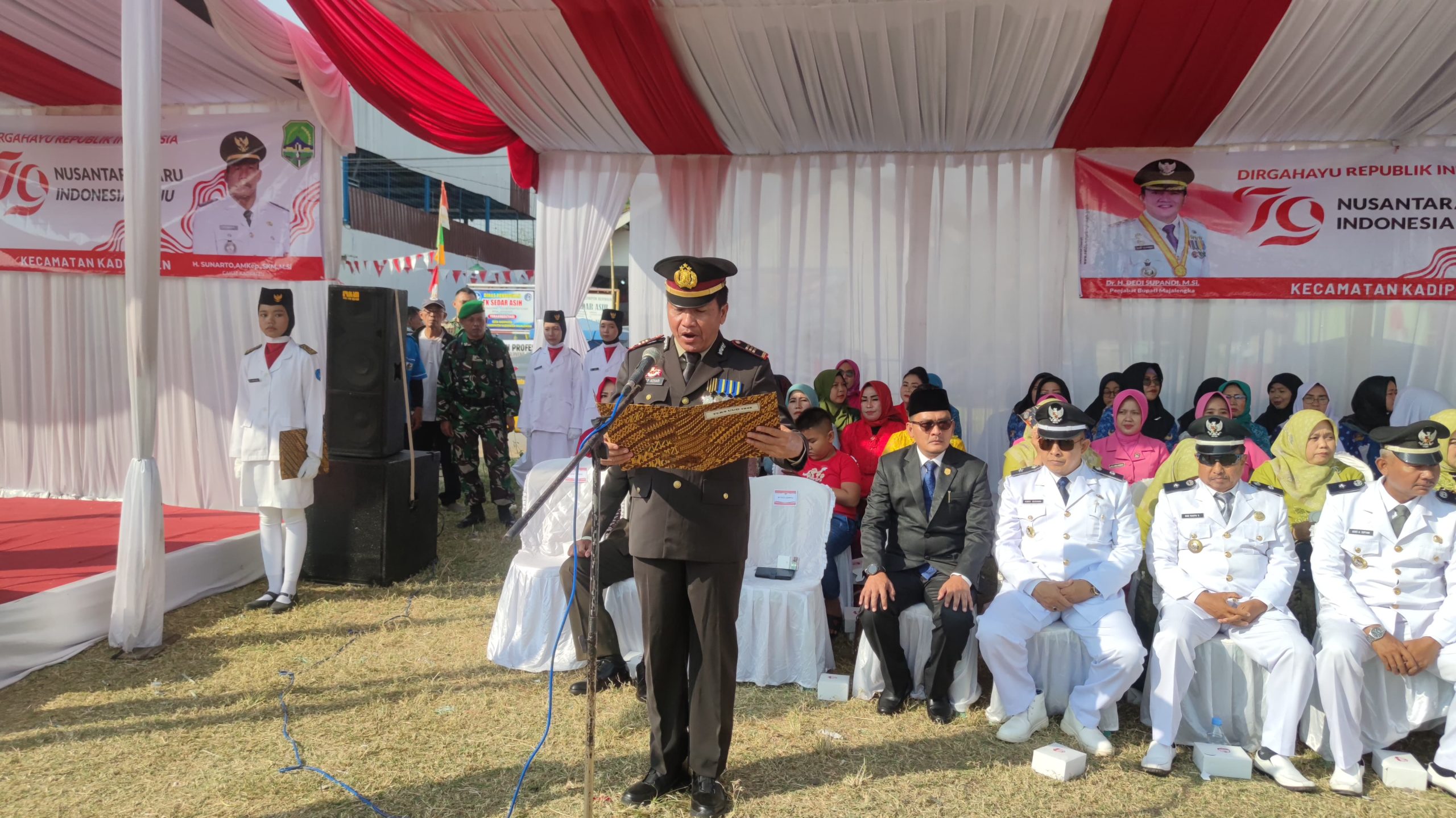 Majalengka – Dalam rangka memperingati Hari Ulang Tahun Kemerdekaan Republik Indonesia yang ke-79, Polsek Kadipaten Polres Majalengka Polda Jabar melaksanakan upacara bendera di Lapangan Sedar, Kecamatan Kadipaten, Kabupaten Majalengka. Kegiatan ini berlangsung dengan khidmat, dihadiri oleh berbagai elemen masyarakat dan instansi pemerintah setempat. Upacara ini menjadi salah satu momen penting untuk mengenang jasa para pahlawan dan memperkuat rasa cinta tanah air di kalangan masyarakat. Sabtu (17/08/2024).