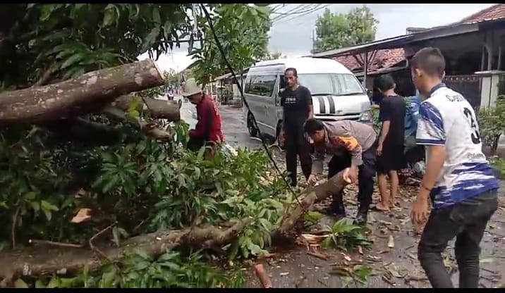 Evakuasi pohon tumbang dilakukan segera karena mengganggu arus lalu lintas di Jalan Raya Mundu – Arjawinangun.