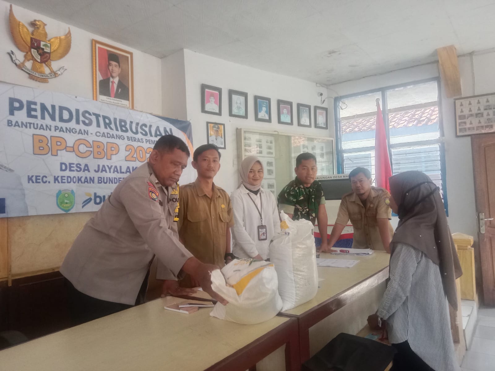 INDRAMAYU – Bhabinkamtibmas Desa Jayalaksana, Polsek Kedokanbunder, Polres Indramayu Polda Jabar AIPTU Kusnaedi, melaksanakan pengamanan kegiatan pendistribusian bantuan pangan dari Cadangan Beras Pemerintah (CBP) tahun 2025 di Balai Desa Jayalaksana, Kecamatan Kedokanbunder, Kabupaten Indramayu, Senin (21/7/2025) pagi.