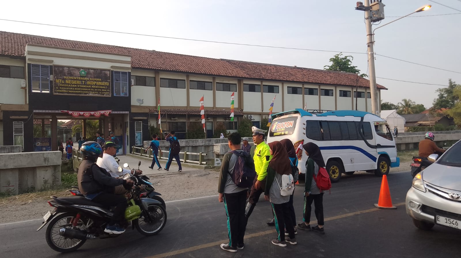 Kegiatan pengaturan lalulintas pagi ini dilaksanakan di tiga sekolah, yaitu SMAN 1 Lohbener, MTSN 7 Lohbener dan SMK Telematika Sindang Kerta, Kecamatan Lohbener, Kabupaten Indramayu.