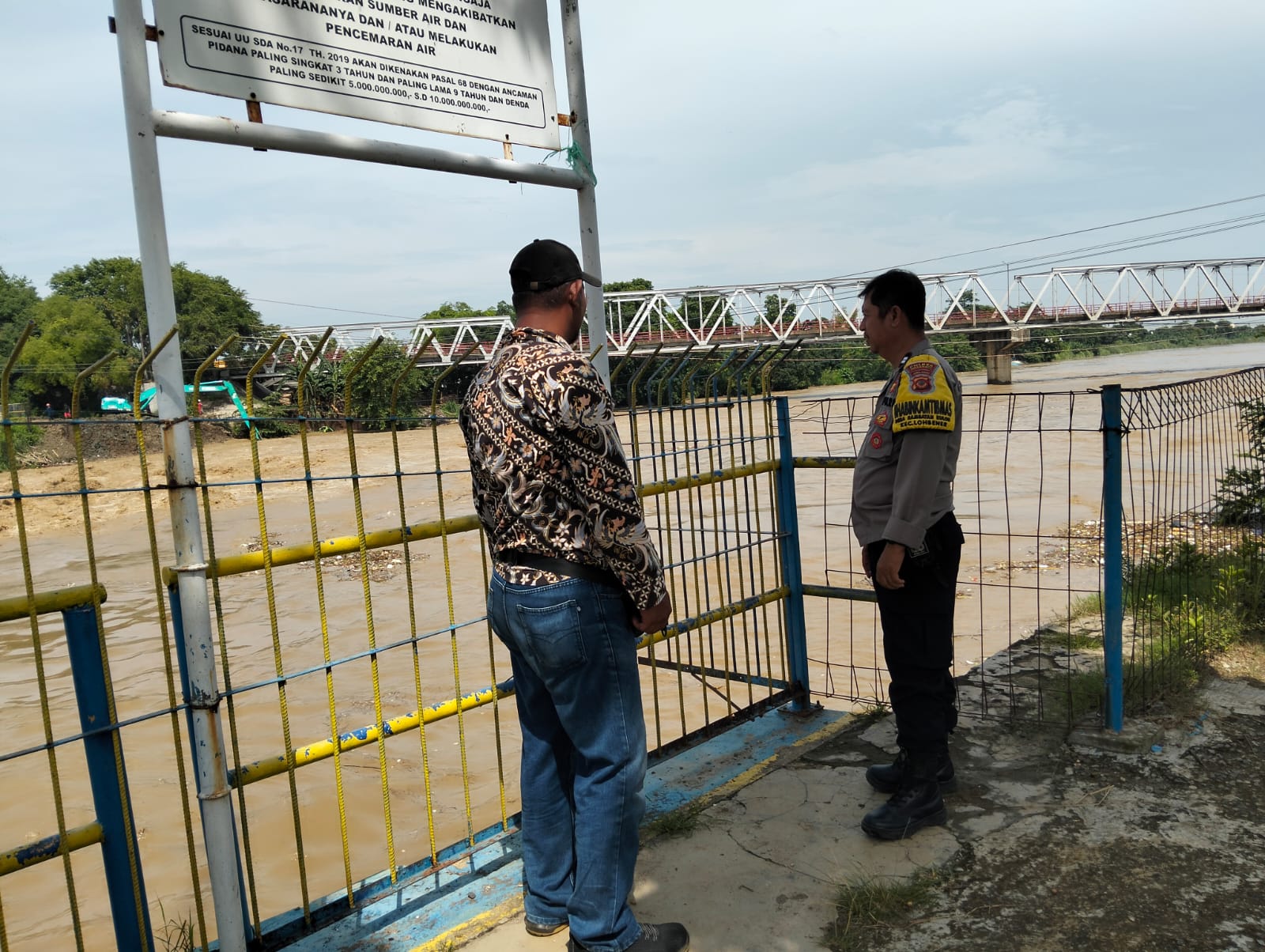 Indramayu – Personel Polsek Lohbener Polres Indramayu Polda Jabar monitoring dan koordinasi dengan Petugas BBWSCC terkait debit air Sungai Cimanuk, Kecamatan Lohbener, Kabupaten Indramayu, Jumat (24/1/2025)