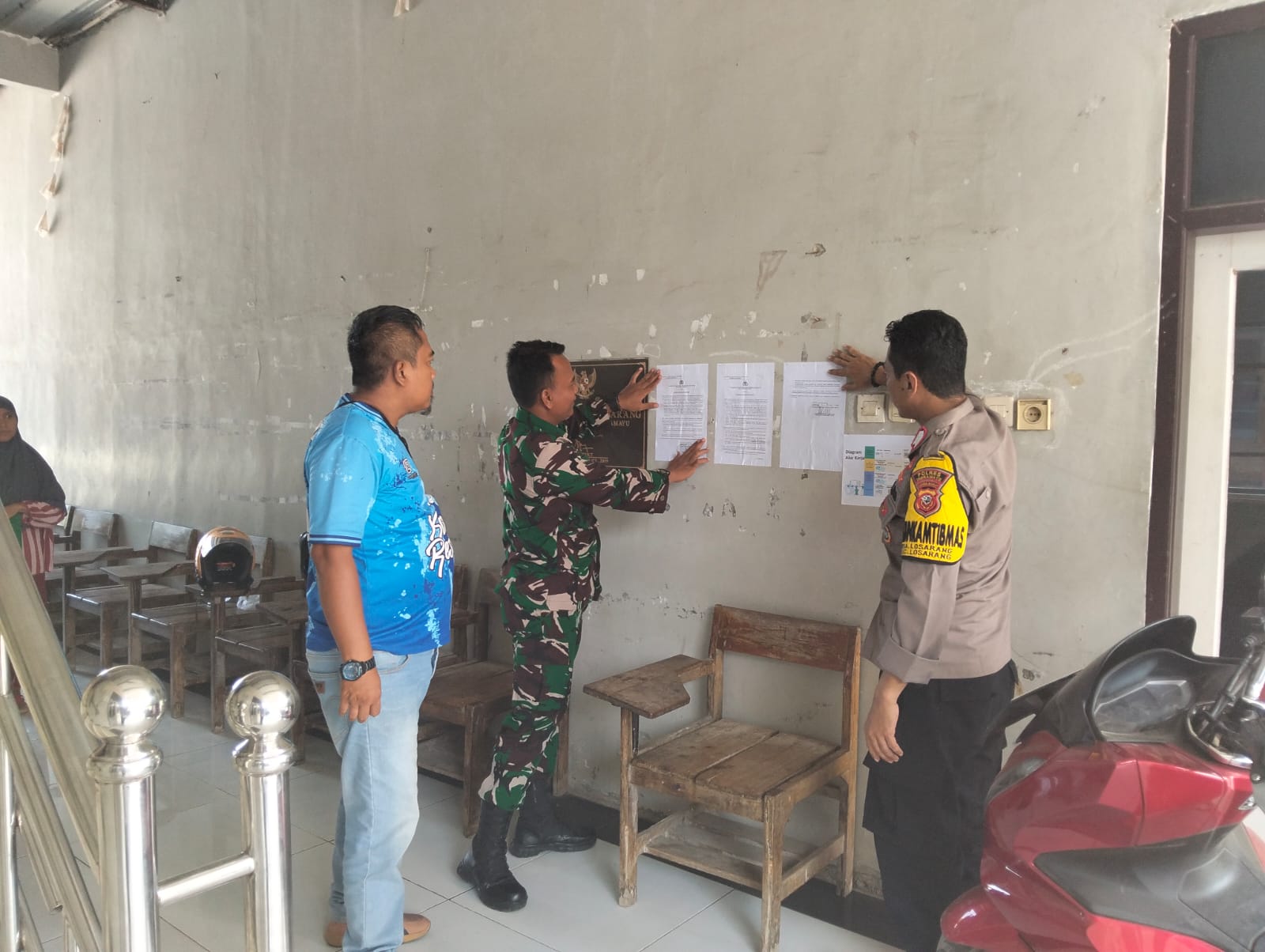 Terlihat, personel Bhabinkamtibmas bersama anggota Koramil Losarang melakukan pemasangan Maklumat Kapolda Jawa Barat di Kantor Desa Losarang, Kecamatan Losarang, Kabupaten Indramayu.