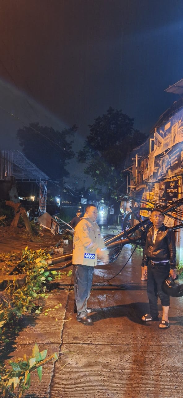 POLRES BOGOR – Desa Sukamaju Polsek Megamendung Polres Bogor Bhabinkamtibmas Aiptu Saeful Bahri melaksanakan pengaturan jalan yang tertutup tiang Telkom dan pohon tumbang, yang di akibatkan hujan deras sehingga pagar tembok roboh dan menimpa tiang telkom hingga menutup jalan, yang hanya bisa di lintasi kendaraan roda 2, sambil menunggu pihak terkait, BPBD dan pihak telkom untuk epakuasi, lokasi kejadian jln alternatif cikopo selatan, kp. Pasir kaliki rt 03/06 desa sukamaju kec megamendung – bogor, Bhabinkamtibmas bersama warga masih stanbay di lokasi kejadian pada hari Rabu malam 8 Januari 2025 pukul 22.00 wib, dilakukan evakuasi sampai dini hari Kamis 9 Januari 2025. Jumat (10/1/2025)