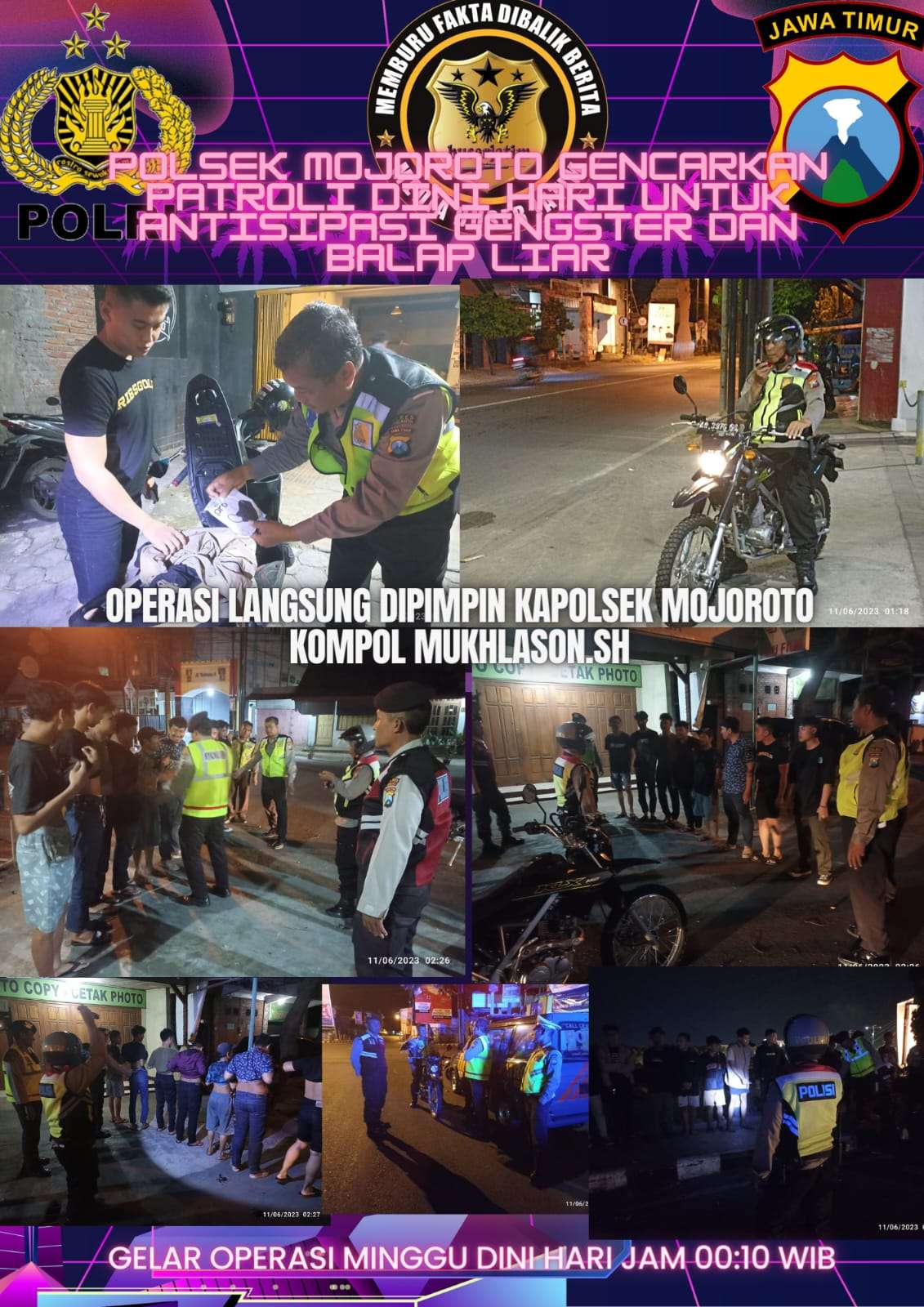 Kegiatan dilakukan pada Minggu dini hari 11 Juni 2023, dimulai pukul 00.10 WIB sampai selesai. Dipimpin Kapolsek Mojoroto Kompol Mukhlason.SH, petugas menyisir seluruh jalan protokol, perkampungan, obyek vital dan area bantaran Sungai Brantas (Dermaga).
