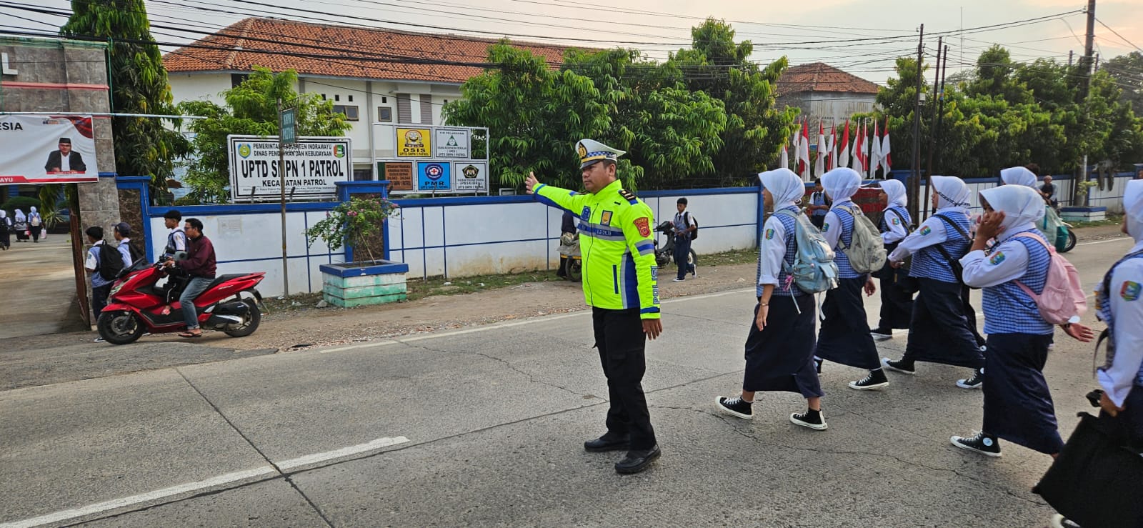 Pengaturan lalu lintas dilakukan IPDA H. Waryanto, S.H., M.Kn. Ia turun ke jalan untuk membantu para pelajar yang hendak menyeberang, sekaligus mengurai arus kendaraan yang mulai ramai.
