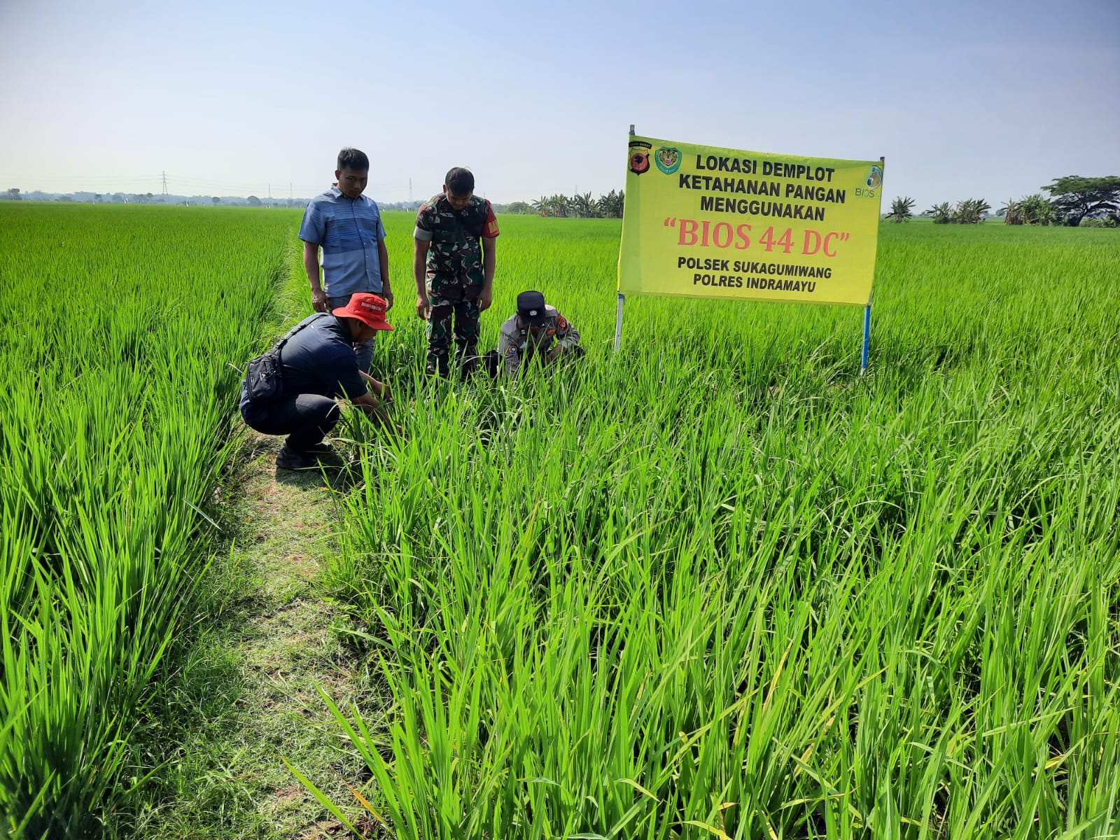 Indramayu, – Polsek Sukagumiwang Polres Indramayu Polda Jabar, bekerja sama dengan Koramil dan PPL Desa Gedangan, melakukan kegiatan pengamatan dan monitoring lahan sawah demplot BIOS 44 DC yang dimiliki oleh Bapak Casuni.