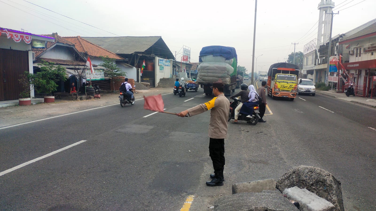 Kali ini pengaturan lalu lintas pagi dilakukan di U- Turn jalan raya Depan Kantor Kecamatan Kertasemaya, Kabupaten Indramayu, Selasa (22/8/2023)