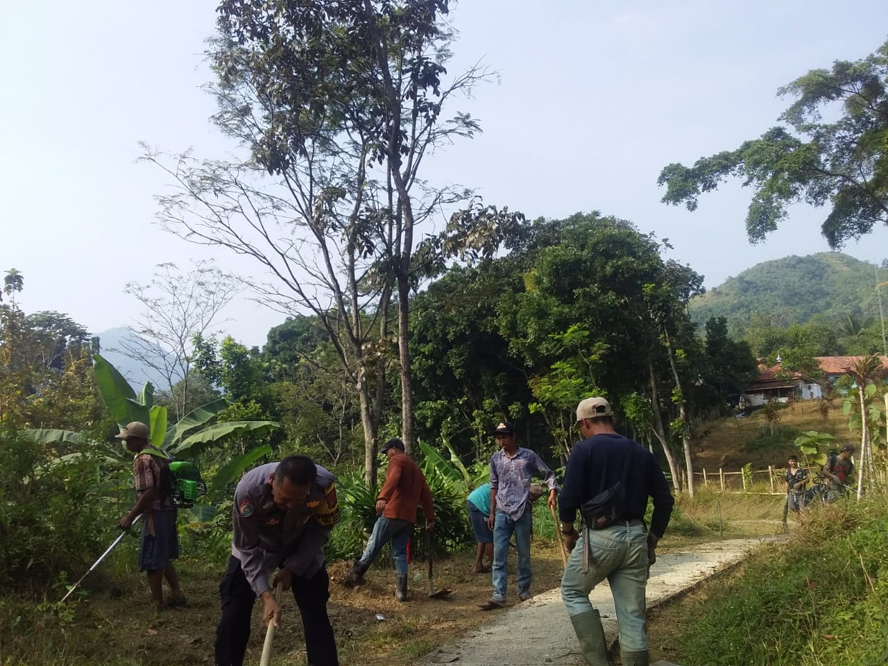 Polres Bogor – Bhabinkamtibmas Desa Sukamakmur Aiptu ENDANG YUSUP SUBARJA melaksanakan Giat Kerjabakti JUM’AT BERSIH Membersihkan Jalan Lingkungan Di Kp. Cikoneng Jati RT. 01/05 Desa Sukamakmur Kec. Sukamakmur Kab. Bogor, Bersinergi Dengan Warga Masyarakat Untuk Menciptakan Lingkungan Yang Bersih Aman Serta Nyaman dan kondusif, Sabtu (5/08/2023).