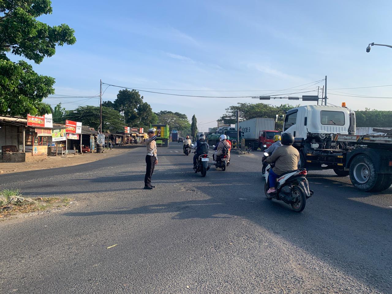 INDRAMAYU – Personel Polsek Widasari Polres Indramayu Polda Jabar melaksanakan kegiatan pengaturan lalu lintas (gatur lalin) di simpang tiga Bangkaloa, Kecamatan Widasari, Kabupaten Indramayu, Selasa (29/7/2025) pagi.