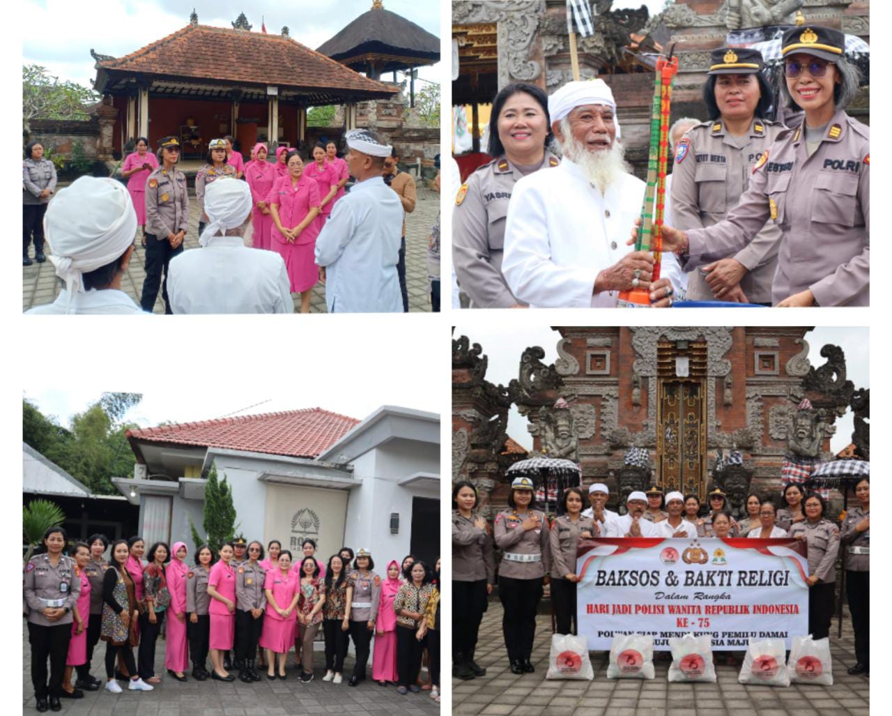 Seijin Kapolres Tabanan AKBP Leo Dedy Defretes, S.H, M.H., Polwan Polres Tabanan melaksanakan bakti sosial dan bakti Relegi di beberapa tempat yang ada di kabupaten Tabanan bersama dengan Bhayangkari Cabang Tabanan. Kegiatan bakti sosial dan bakti relegi dalam rangka HUT Polwan Ke 75 tahun 2023 ini, diawali dengan melaksanakan kegiatan kebersihan di Pura Bingin ambe, Desa Banjar Anyar kecamatan Kediri Kabupaten Tabanan, yang dipimpin Pakor Polwan Polwan Polres Tabanan AKP Ni Made Lestari, S.H., M.H., didampingi Ketua Panitia Hari Jadi Polwan Polres Tabanan Akp Ni Made Arie Tara Kumalasari, S.T.K., pada hari Sabtu 5 Agustus 2023 pagi.Kegiatan bhakti sosial dan bakti relegi ini juga berkolaborasi dengan Bhayangkari Cabang Tabanan yang dihadiri Ketua Bhayangkari Cabang Tabanan Ny. Ina Dedy Defretes dan Pengurus Bhayangkari Cabang Tabanan.