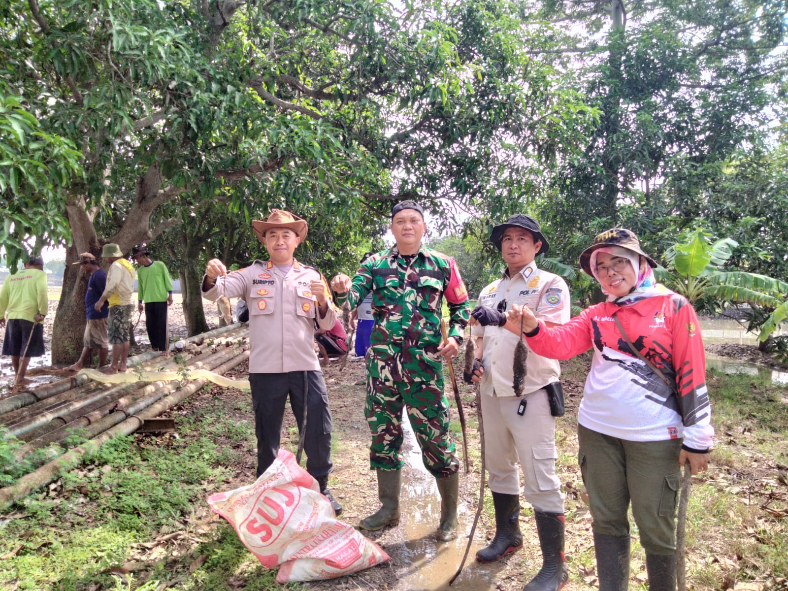 Indramayu – Kapolsek Widasari, Polres Indramayu Polda Jabar AKP Suripto, S.H., bersama Babinsa Pelda Sarjaya, Kuwu Desa Ujung Pendok Jaya Waeliyah, dan masyarakat setempat, memburu hama tikus di area pesawahan Desa Ujung Pendok Jaya, Kecamatan Widasari, Kabupaten Indramayu, Rabu (15/1/2025).
