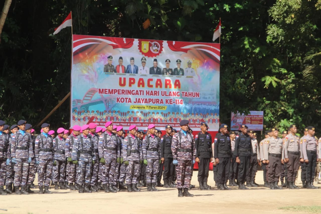 JAYAPURA PAPUA , BUSERJATIM. COM GRUOP– Prajurit Batalyon Marinir Pertahanan Pangkalan (Yonmarhanlan) X Jayapura Pasmar 3 mengikuti upacara dalam rangka Hari Ulang Tahun (HUT) Ke-114 Kota Jayapura yang dilaksanakan di Lapangan Nidjo, Tj. Ria, kecamatan Jayapura Utara, Kota Jayapura, Papua. Kamis (07/03/2024).